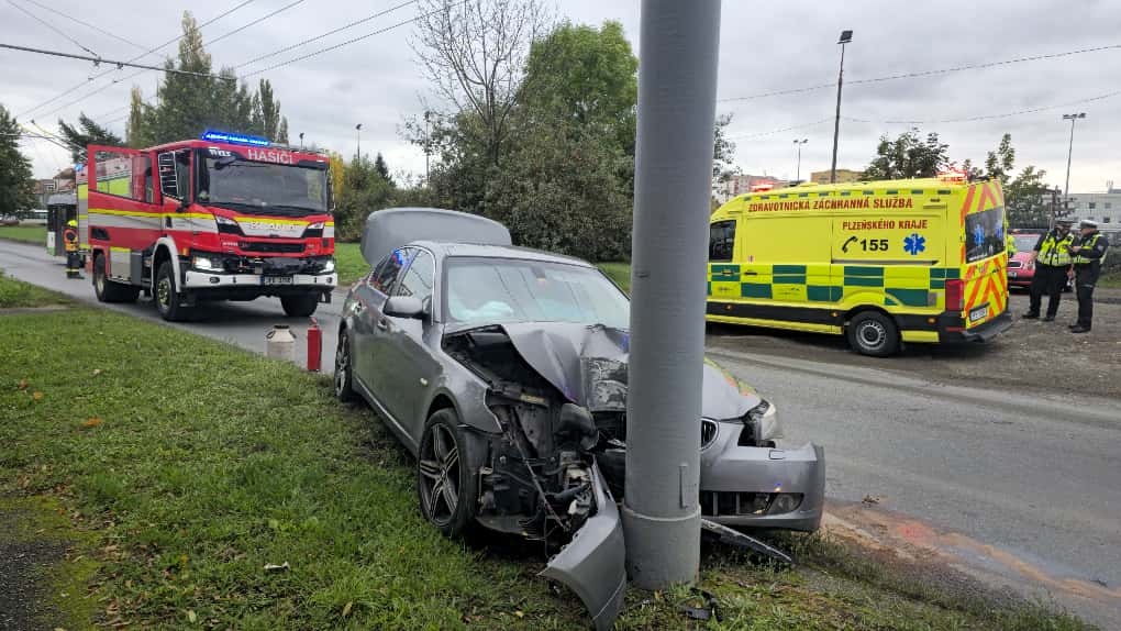Dnes krátce před polednem došlo v Lobezské ulici v Plzni na Slovanech k dopravní nehodě, během níž rumunská řidička vozu značky BMW vyjela ze silnice a čelně narazila do sloupu trakčního vedení.