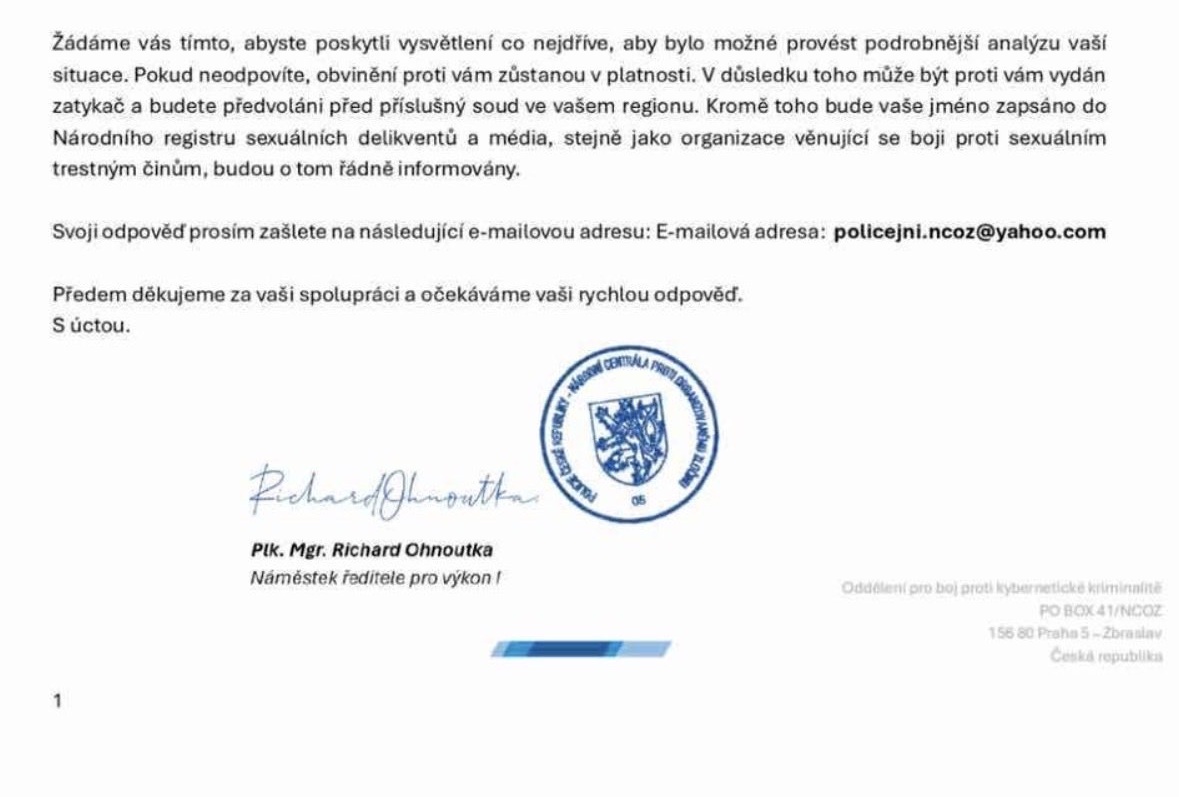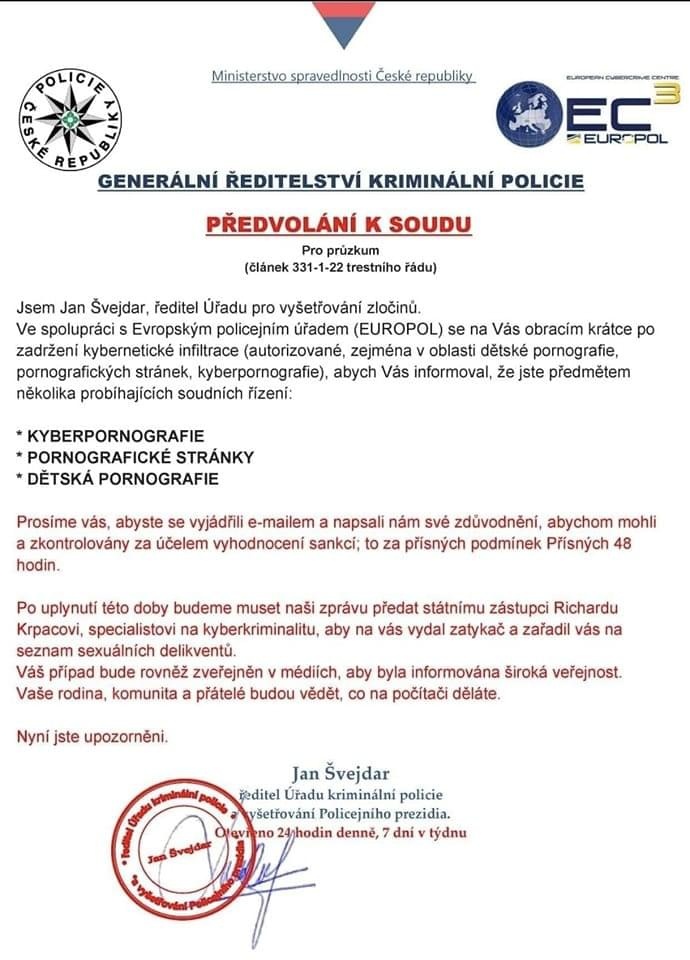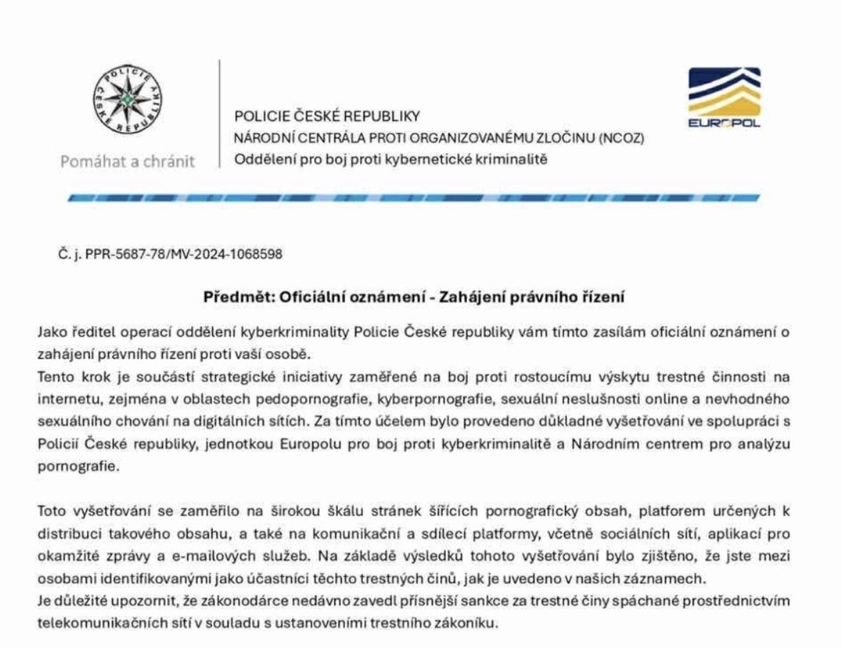 V internetovém prostoru se znovu objevil falešný dopis policie, informující adresáty o zahájení "právního řízení" kvůli sledování dětské nebo jiné závadové pornografie na internetu.