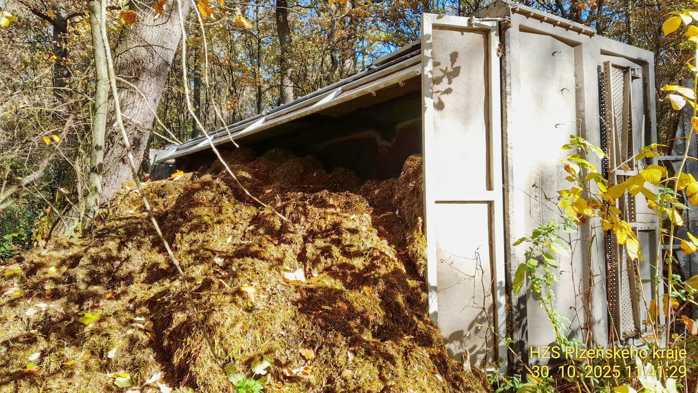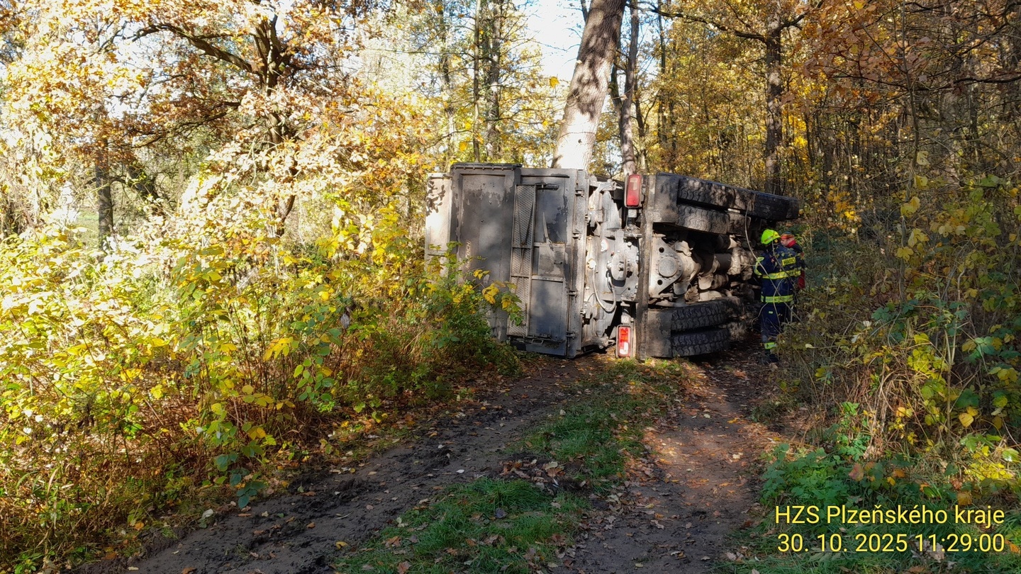 Dnes po desáté hodině dopoledne došlo na lesní cestě poblíž Ohučova na Domažlicku k dopravní nehodě, během které se převrátil nákladní vůz Tatra. Vozidlo převáželo siláž, která se při převrácení částečně vysypala, přičemž z ní také vytéká silážní voda.