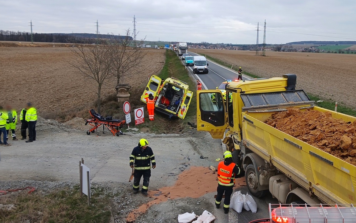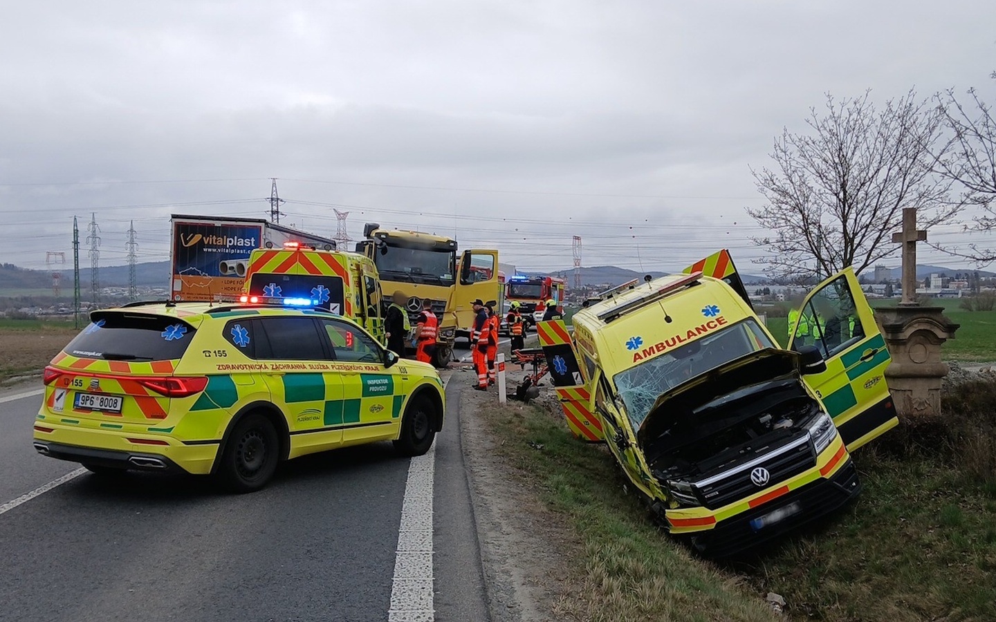 Dnes před devátou hodinou dopoledne došlo na silnici I/27 vedoucí z Přeštic na Plzeň, zhruba na úrovni Dolní Lukavice, k dopravní nehodě, během které se nákladní vůz značky Mercedes střetl se sanitkou, která transportovala pacienta a jela zapnutými majáky.