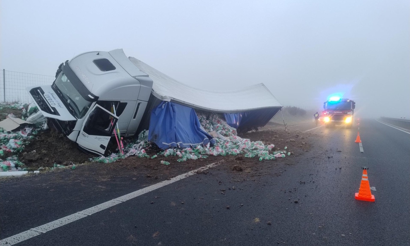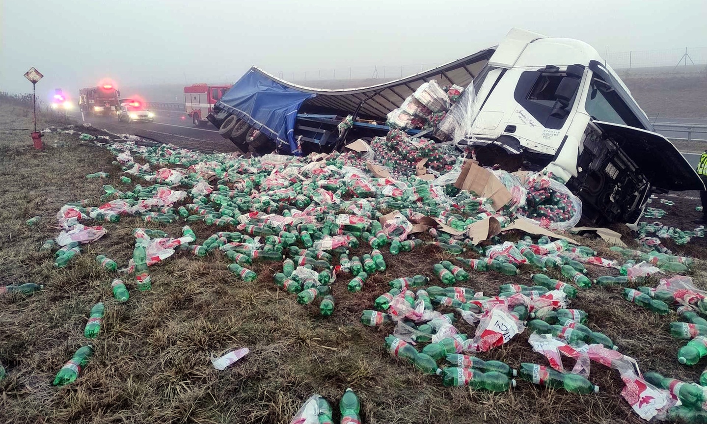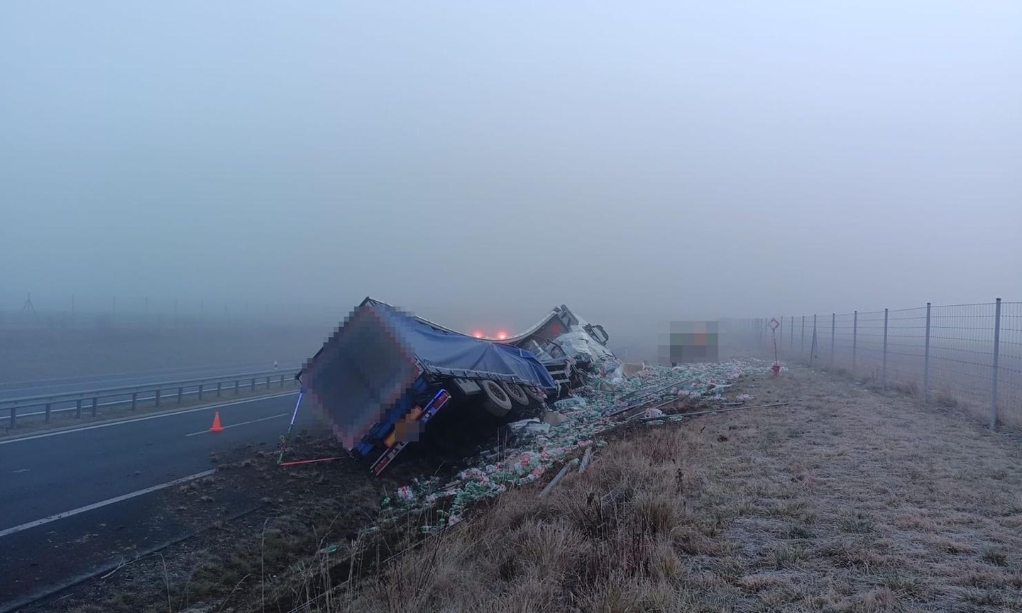 „Kamion je částečně převrácený na boku. Náklad PET láhví je vysypaný do jednoho jízdního pruhu. Na místě nehody je hustá mlha, proto prosíme řidiče, aby zpomalili. Hasiči zajišťují místo nehody,“ uvedl mluvčí hasičů.
