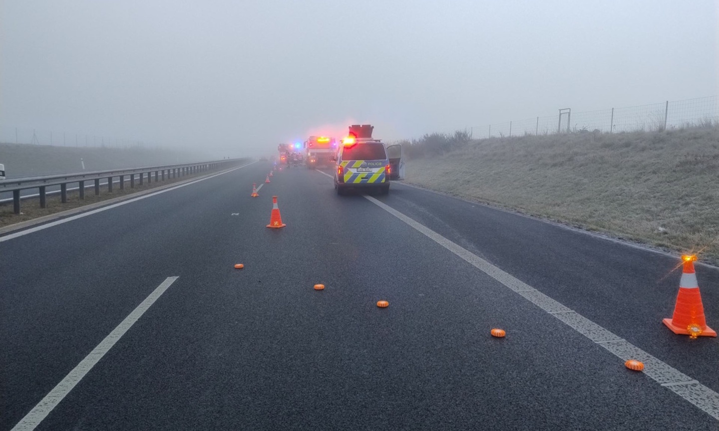 Na místo vyjely všechny záchranné složky, ukázalo se ale, že řidič z nehody vyvázl naštěstí bez zranění. Hasiči zajistili prostor a provedli protipožární opatření. Vysypaný náklad PET lahví částečně blokuje jeden jízdní pruh a zásah komplikuje hustá mlha.
