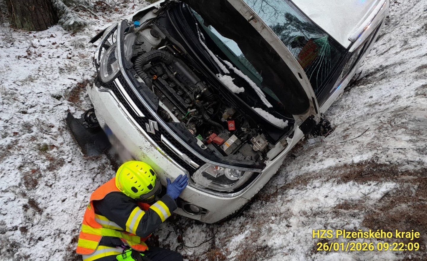 Ke další dopravní nehodě vyjížděly všechny záchranné složky na silnici nedaleko Kamenného Újezdu u Rokycan, kde osobní vozidlo značky Suzuki rovněž vyjelo mimo komunikaci a skončilo v silničním příkopu.