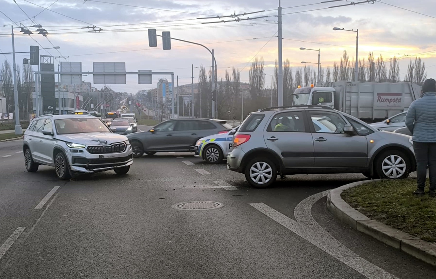 Dnes po sedmé hodině ráno došlo na křižovatce Jateční a Rokycanské ulice v Plzni k dopravní nehodě, během které se střetly dva osobní vozy.