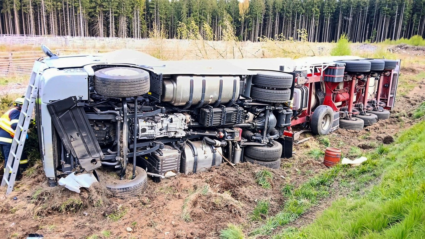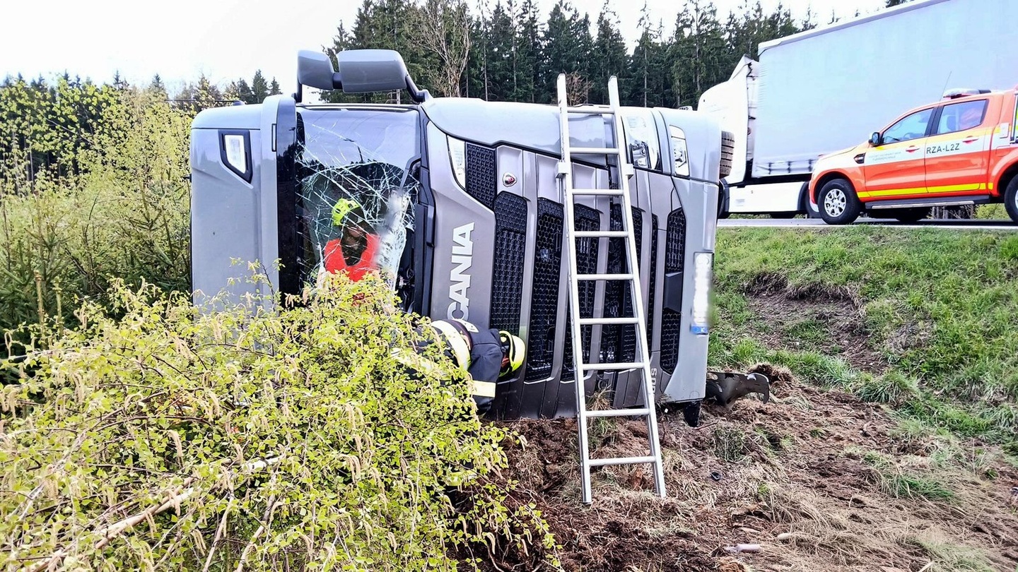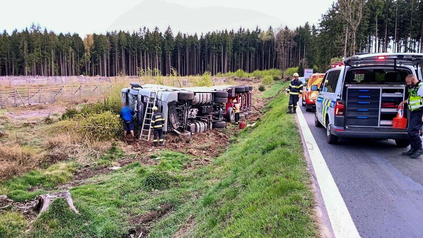 Kamion značky Scania skončil převrácený mimo vozovku a svědci oznámili nejen zranění, ale i zaklínění jeho řidiče, takže na místo vyjížděly všechny záchranné složky.