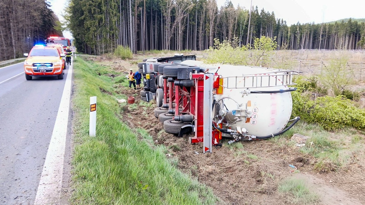 Včera večer po šesté hodině došlo na silnici 26, tedy hlavním tahu z Plzně na Domažlice a dále na Folmavu, nedaleko Babylonu, k nehodě nákladní soupravy převážející plastový granulát.