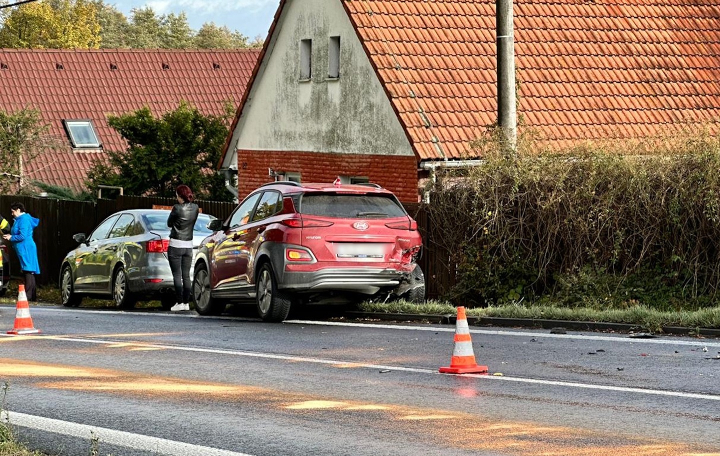 K první nehodě došlo krátce před desátou hodinou na křižovatce silnice č. 20, vedoucí z Plzně do Karlových Varů, a odbočky na Nevřeň, kde se střetly dva osobní vozy. Z místa bylo hlášeno zranění několika osob, takže k nehodě okamžitě vyjely všechny záchranné složky.