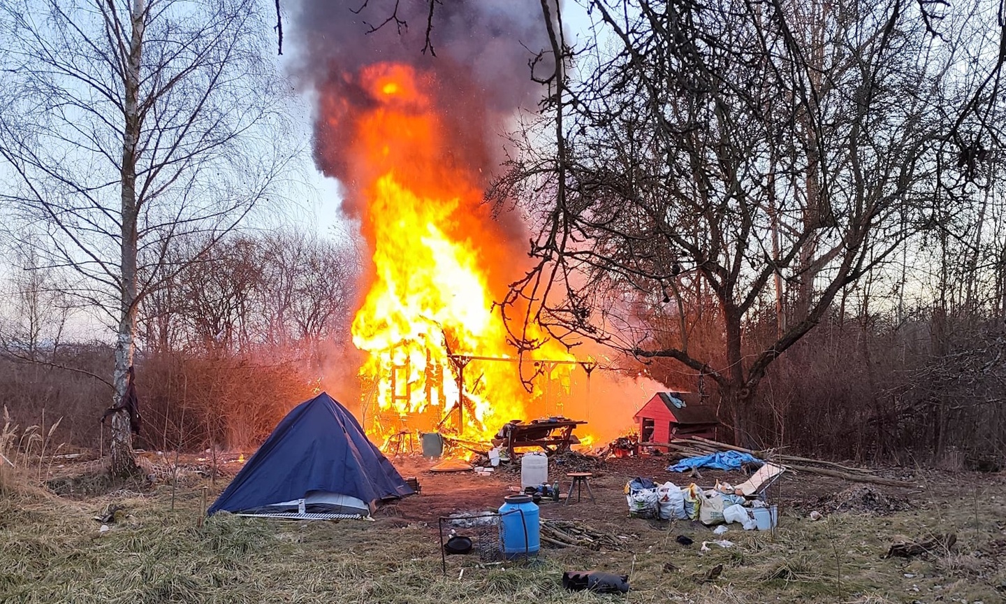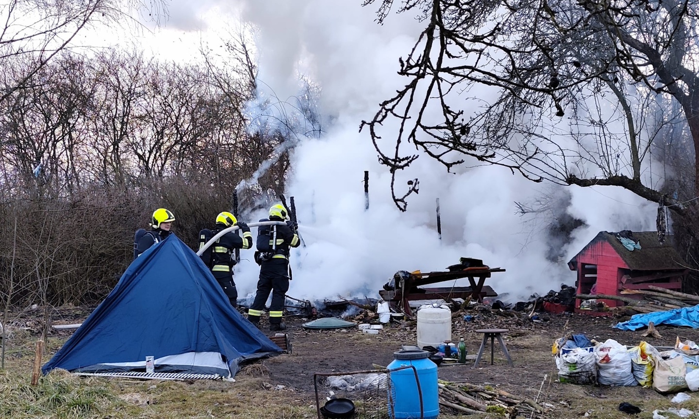 Při příjezdu hasičů a policistů bylo zjištěno, že požár vznikl zřejmě od špatně zajištěných kamen a pohltil celou bezdomoveckou chatku. Hasiči zahájili hasební práce, zlikvidovali plamenné hoření a nyní prohašují trosky provizorní stavby.