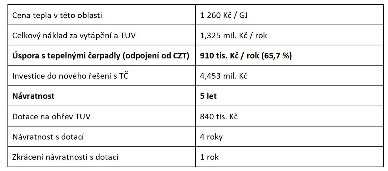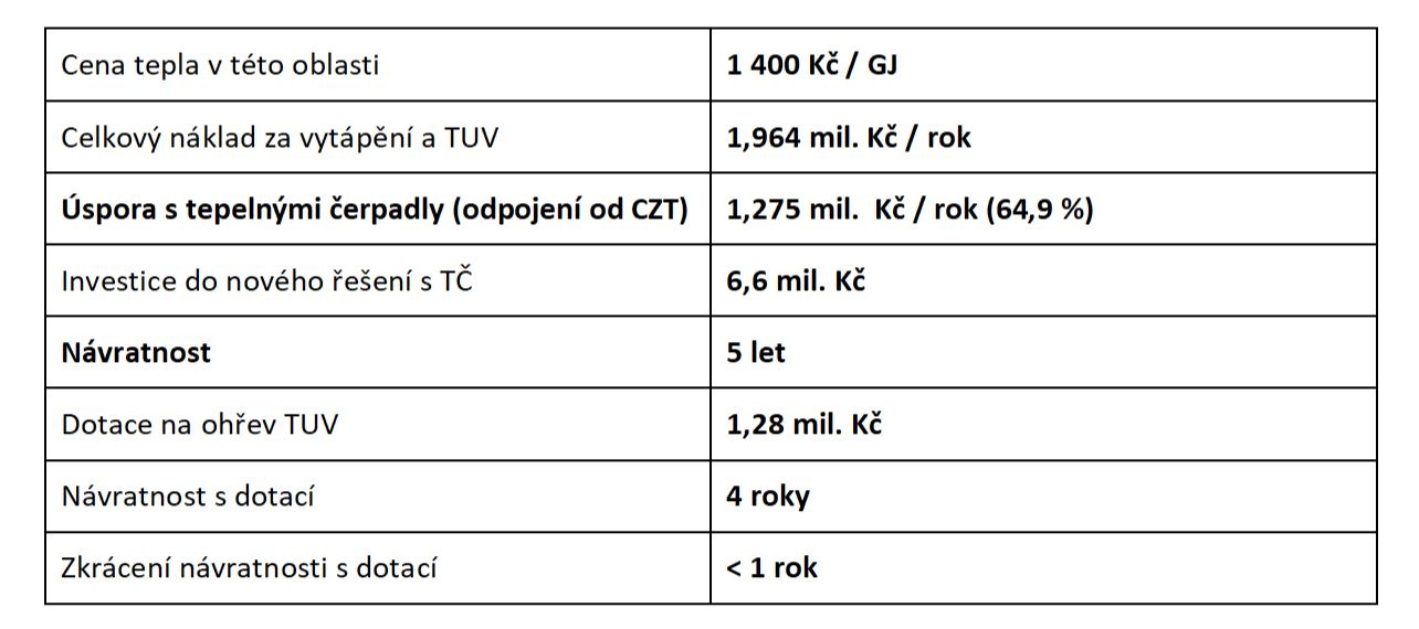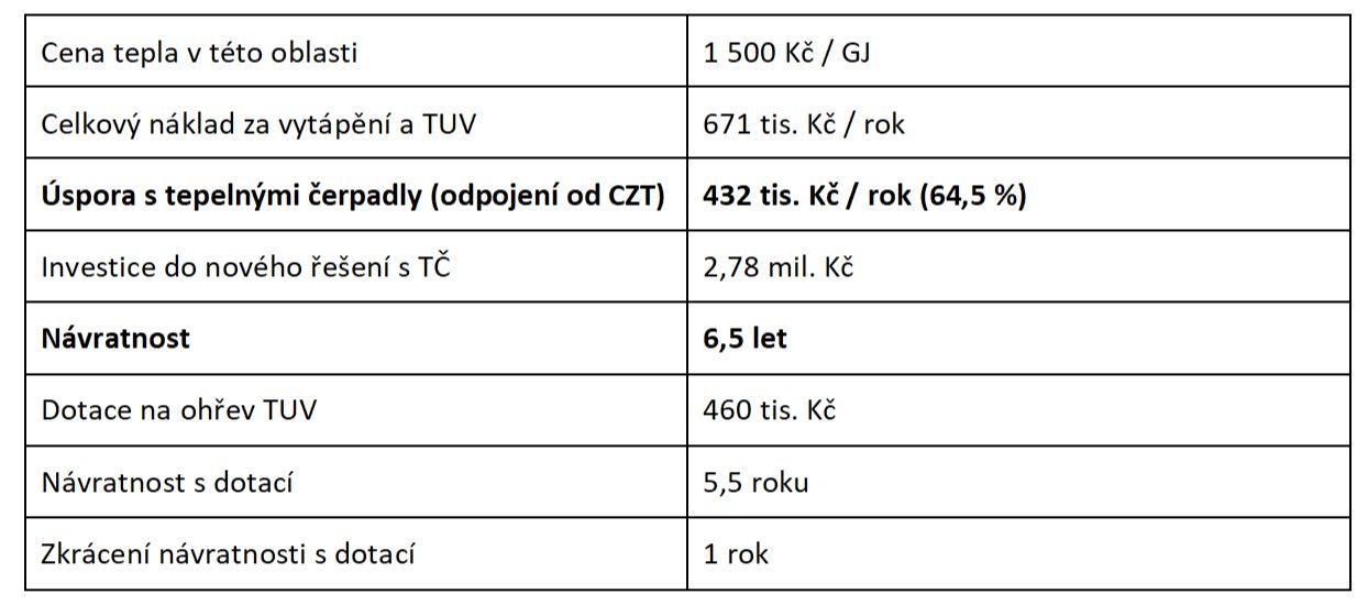 Současné zastavení příjmu žádostí v programu Nová zelená úsporám neznamená, že se modernizace vytápění přestává vyplácet. Z dlouhodobých firemních zkušeností vyplývá, že přechod z centrálního zásobování teplem na vlastní kotelnu s tepelnými čerpadly má u bytových domů návratnost obvykle do 7 let a to i bez dotační podpory.