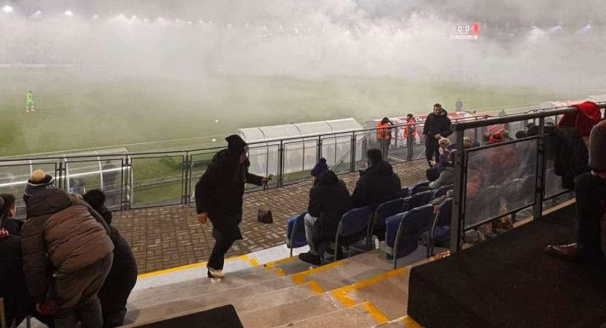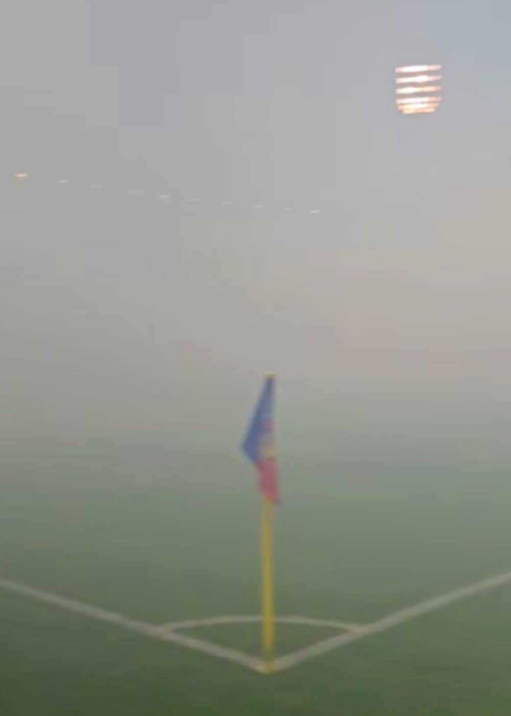 "Přestože jsme, jako pokaždé, před zápasem informovali o zákazu použití pyrotechnických prostředků, došlo na tribuně k jejich odpalu, a to jak ze strany domácích fanoušků, tak i ze strany fanoušků hostujícího týmu. Krátce po zahájení utkání použili příznivci hostujícího týmu pyrotechniku v takové míře, že muselo dojít až k přerušení utkání.