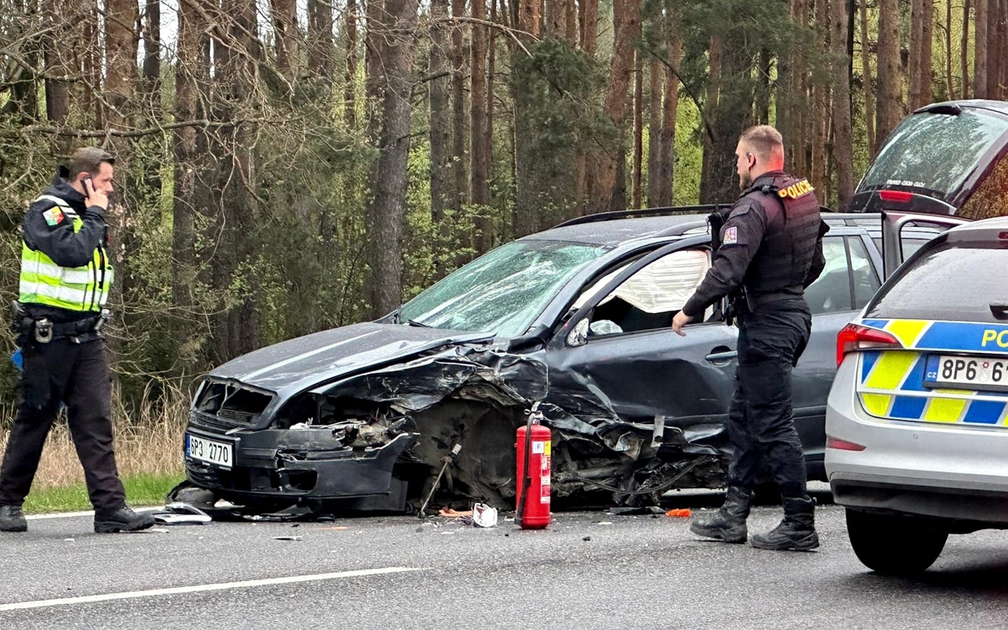 Na místě v tuto chvíli pracují dopravní policisté, policejní psovodi i specialisté s drony a po řidiči Octavie se nadále intenzivně pátrá.