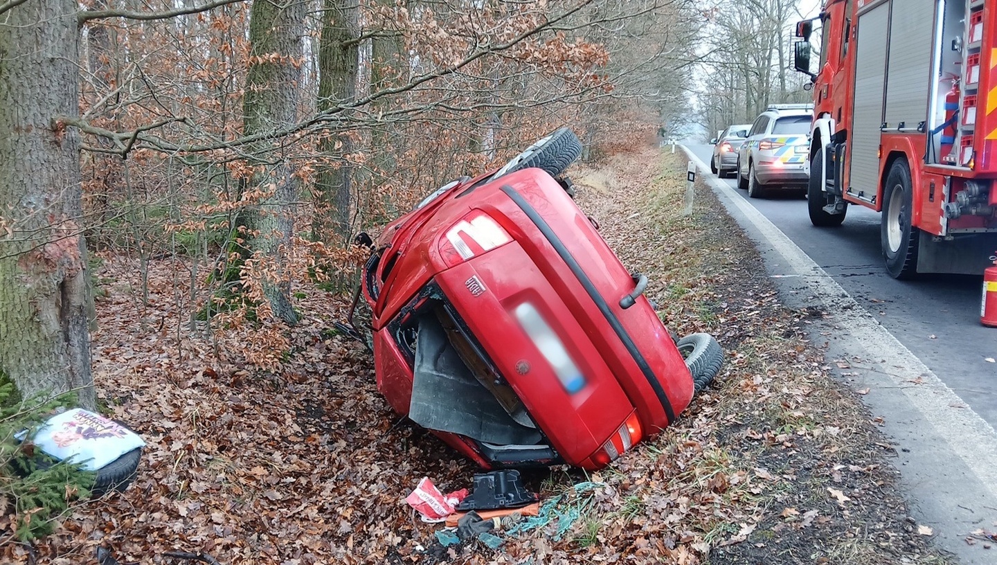 Dnes před jednou hodinou odpoledne došlo u obce Kucíny nedaleko Přeštic k dopravní nehodě, během které osobní vůz Škoda Fabia vyjel ze silnice a převrátil se na střechu.