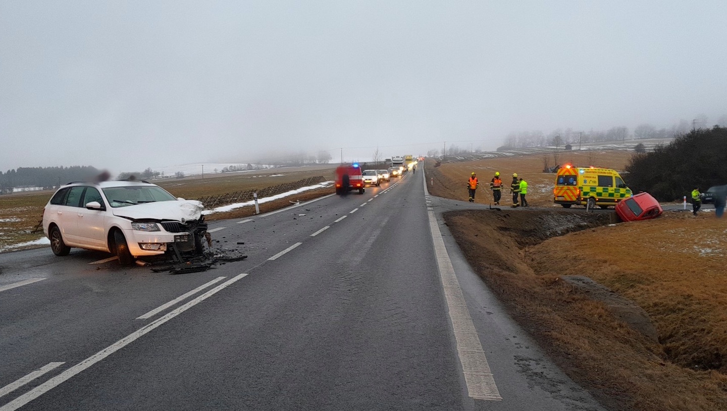 Dnes ráno došlo na silnici I/22 na křižovatce u Soustova, což je malá vesnice, část obce Dlažov v okrese Klatovy, k dopravní nehodě, během které se střetla tři osobní vozidla značek Mitsubishi a Škoda, přičemž jedno skončilo mimo vozovku v poli, druhé částečně na boku v silničním příkopu a třetí zůstalo na silnici.