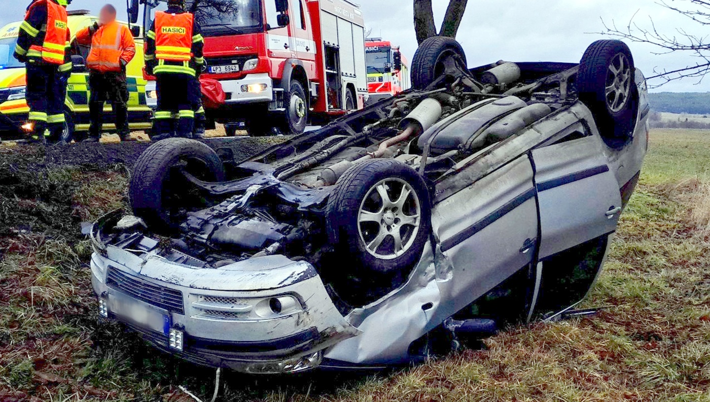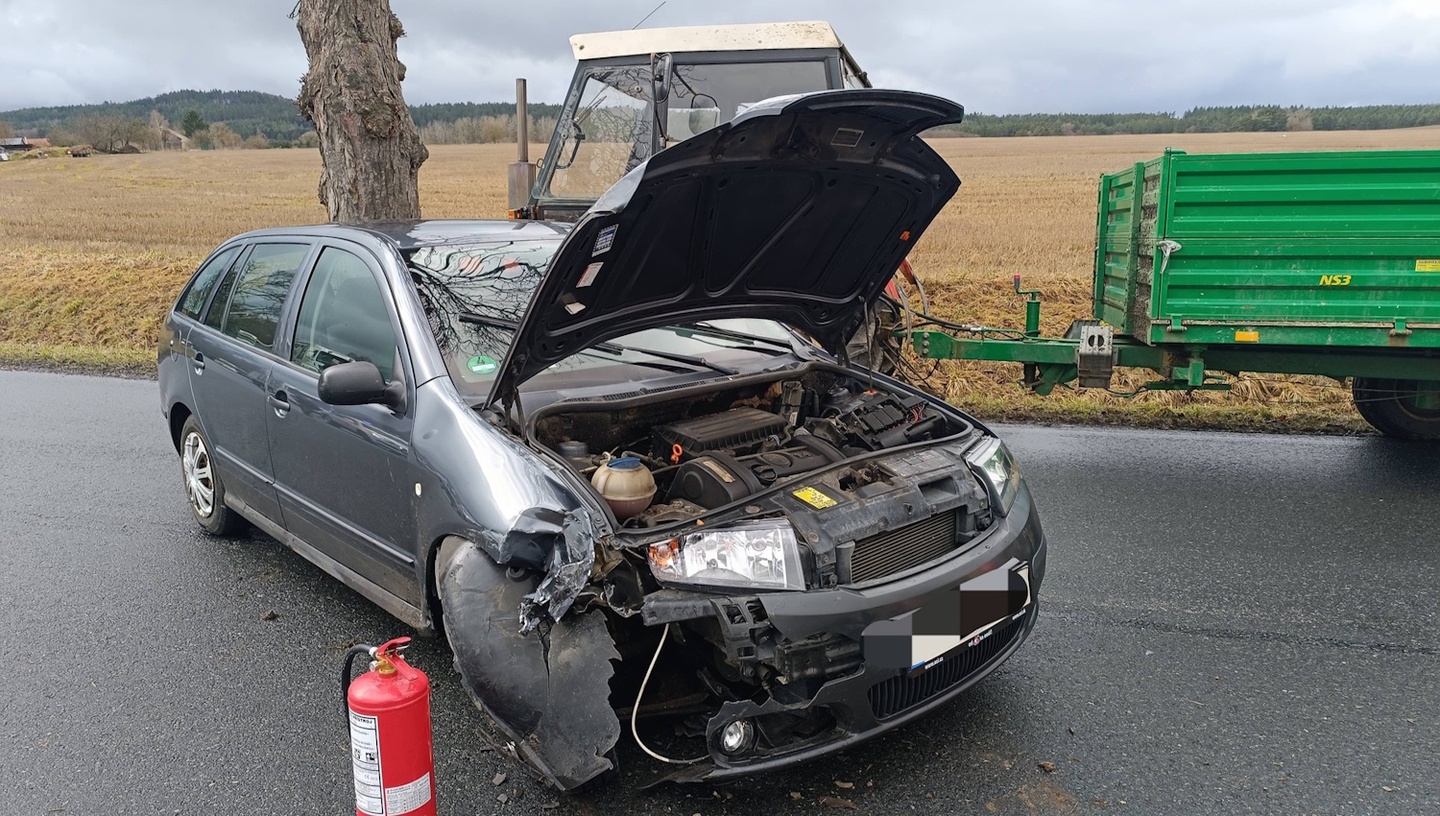 Dnes krátce před jednou hodinou odpoledne došlo na silnici II/200 nedaleko Olešné na Tachovsku k dopravní nehodě, během které se střetla dvě osobní vozidla s traktorem a jedno z nich poté skončilo mimo silnici na střeše.
