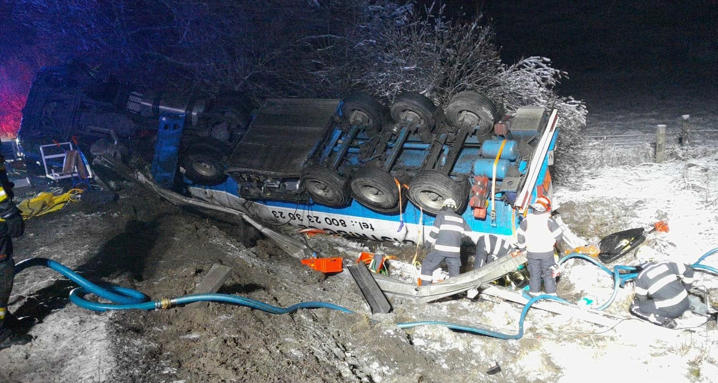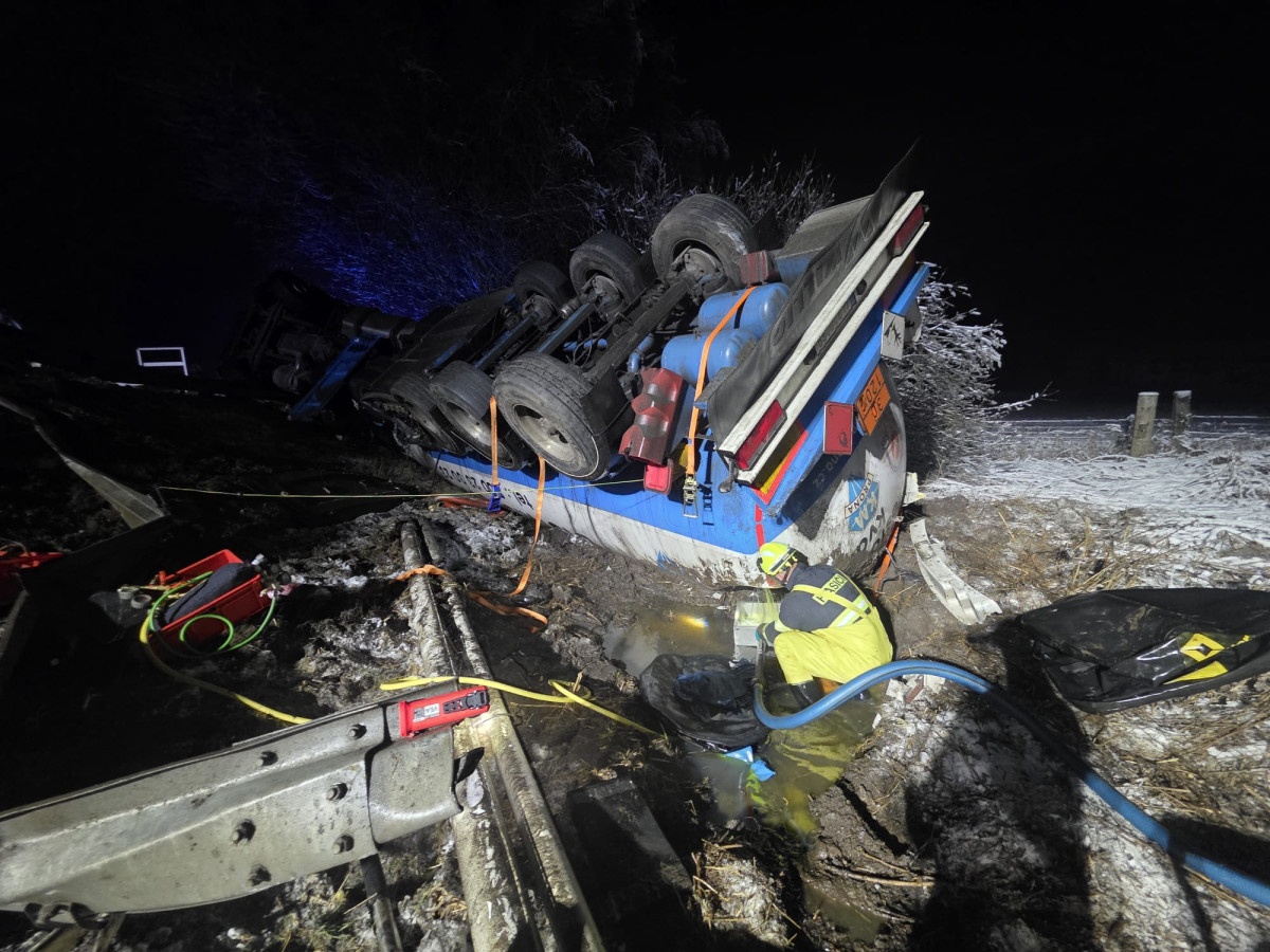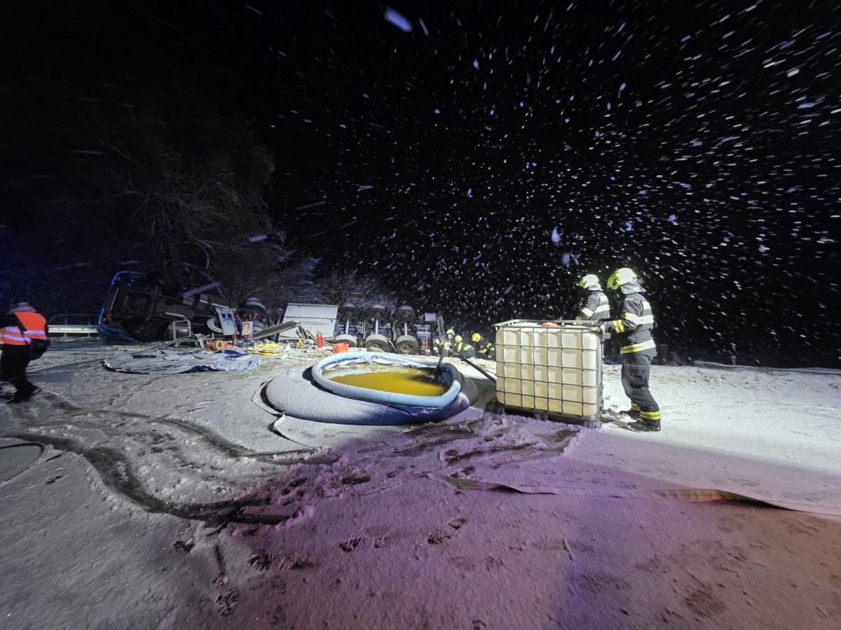 Silnice je obousměrně uzavřena pro veškerou dopravu. Přečerpání a vyproštění kamionu bude náročné a policisté ho odhadují na přibližně 24 hodin.
