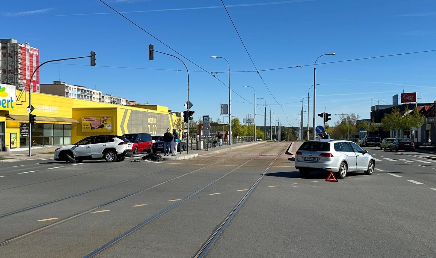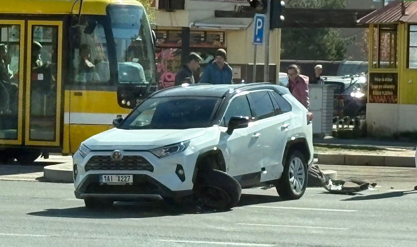 Dnes dopoledne došlo na křižovatce ulic Gerská a Kralovická v Plzni k dopravní nehodě, během které se střetla osobní vozidla značek Volkswagen a Toyota. Náraz byl natolik silný, že Toyota skončila s vylomeným levým předním kolem a zablokovala dva jízdní pruhy.