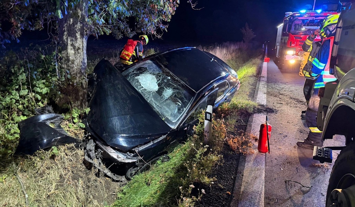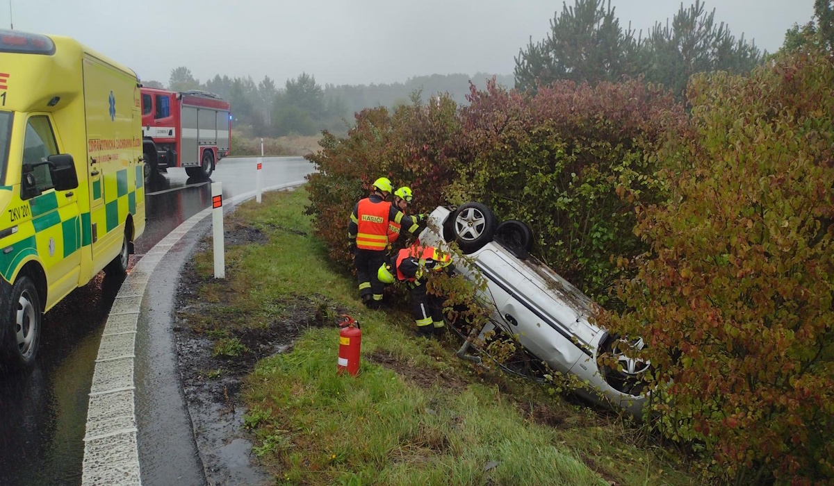 "Řidič osobního vozu značky Volkswagen Bora narozený v roce 1995 pravděpodobně nepřizpůsobil rychlost jízdy, měl dostat smyk, vyjet mimo komunikaci, kde havaroval. Ve vozidle byly spolu s ním ještě další tři osoby. Dvě osoby narozené v letech 1996 a 1992 byly letecky transportovány do zdravotnického zařízení, další dvě tedy řidiče narozeného v roce 1995 a jeho spolujezdkyni narozenou v roce 1986 byli do nemocnice směřováni pozemní cestou.
