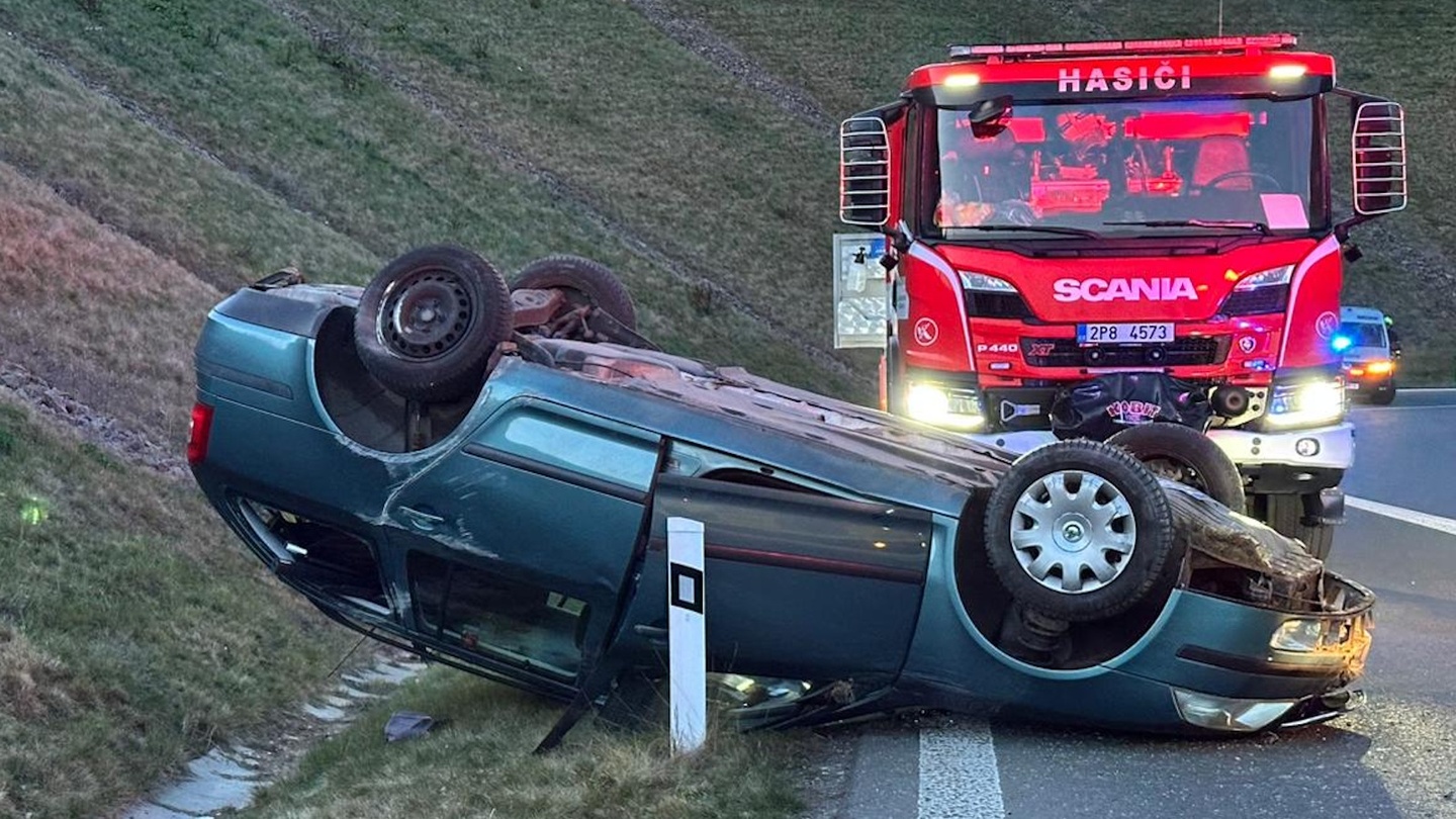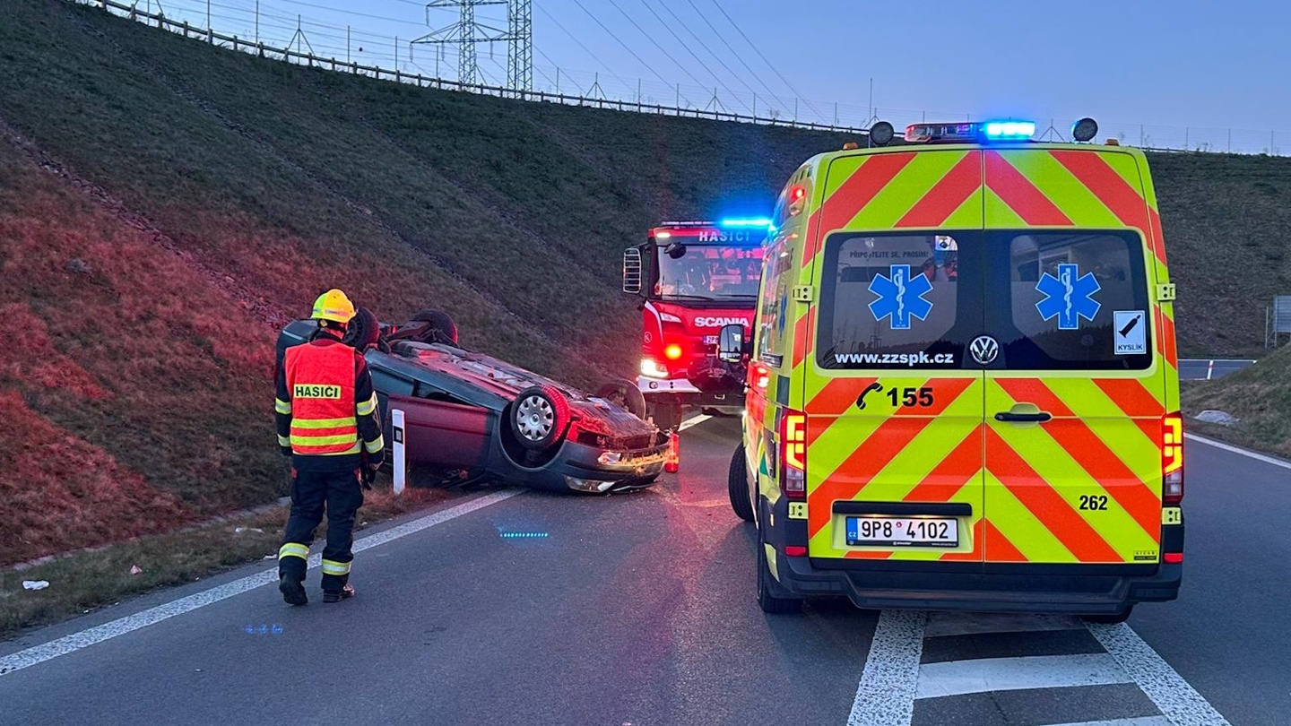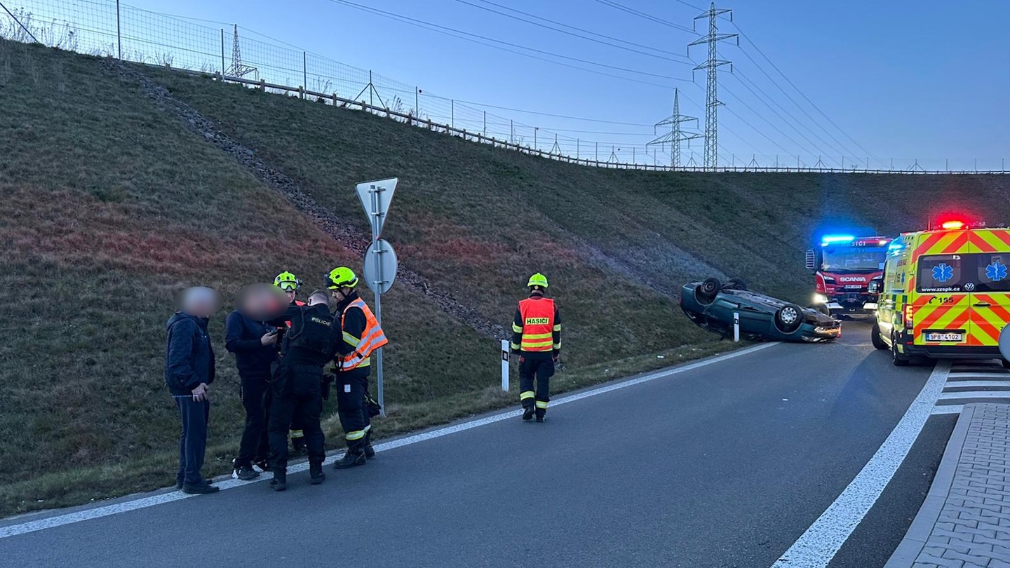 Po půl osmé večer došlo k převrácení osobního vozu Škoda na nájezdu na nový obchvat Plzně nedaleko Radčic. Z místa bylo hlášeno možné zranění posádky vozu, takže k nehodě opět okamžitě vyjely všechny záchranné složky.