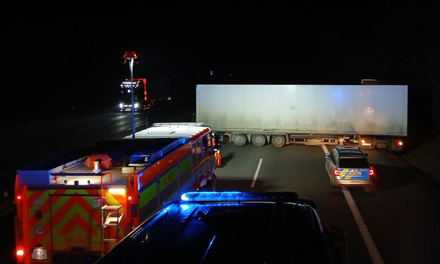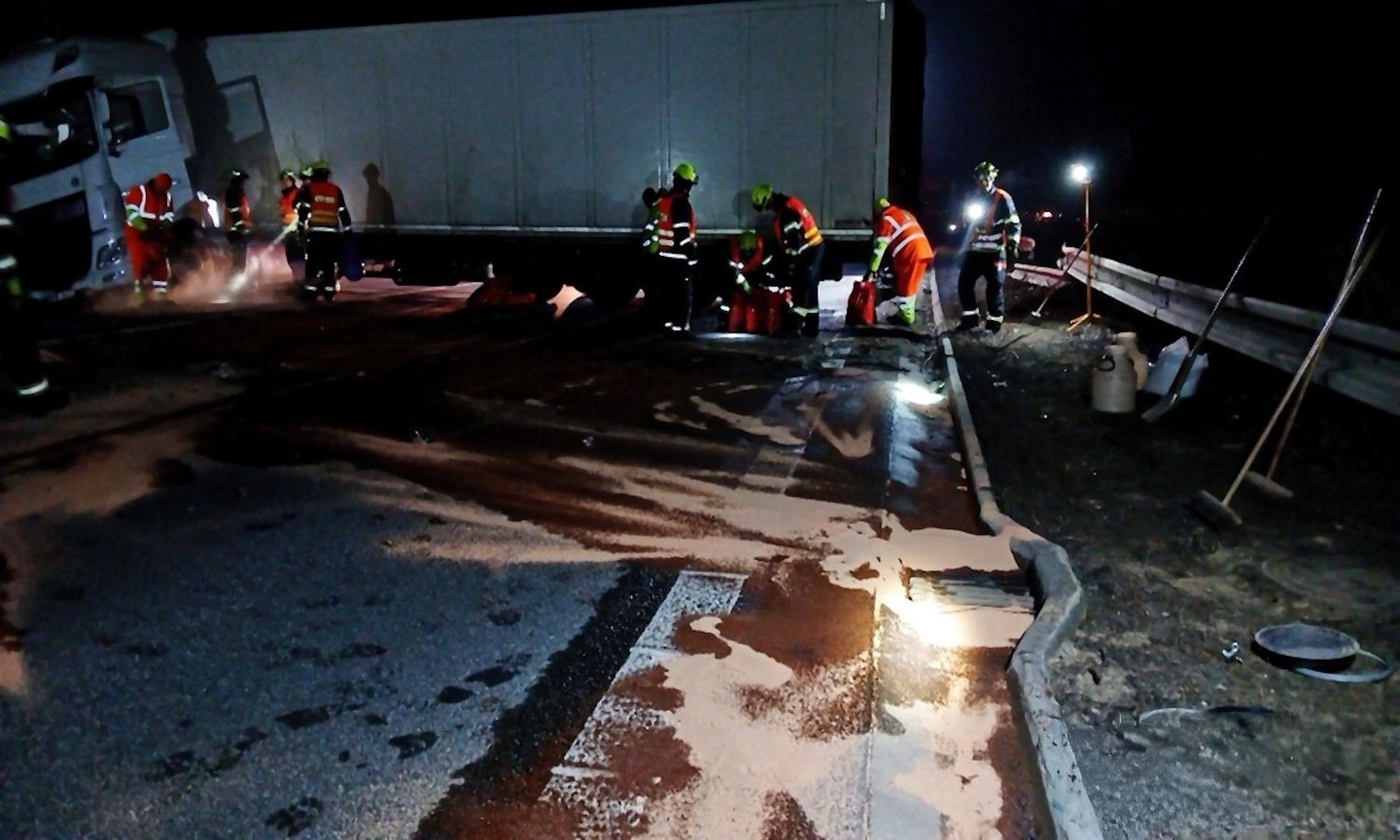 Dnes krátce před půl pátou ráno došlo na 86. kilometru dálnice D5, tedy na obchvatu Plzně, ve směru na Prahu k dopravní nehodě, během které kamion narazil do svodidel, jejichž část byla odmrštěna do protisměru, souprava se následně vzpříčila přes celou šíři dálnice a došlo k masivnímu úniku nafty.