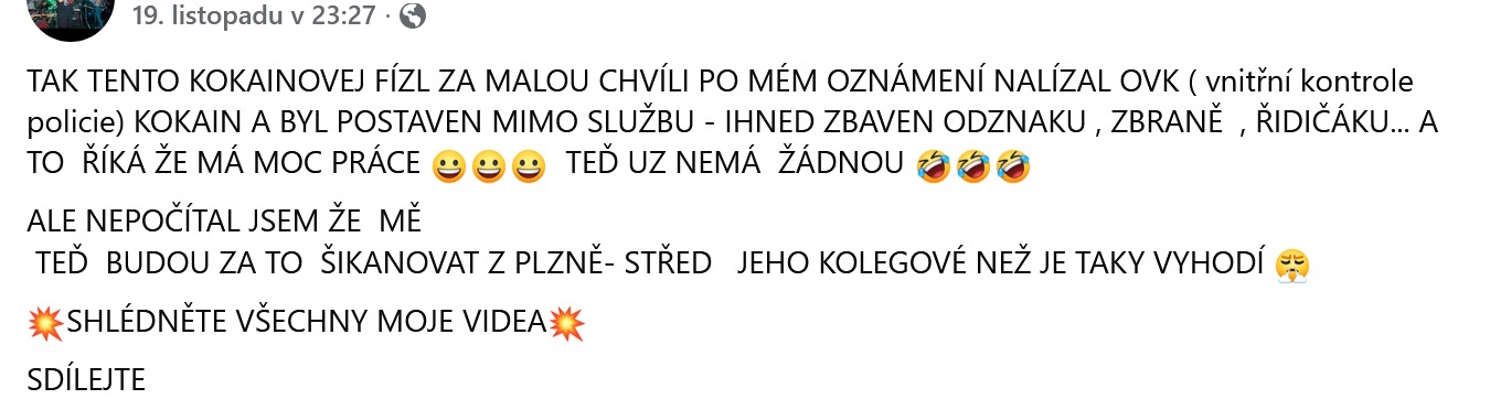 "Chtěli bychom zareagovat na výroky jednoho občana, který ve virtuálním prostředí i ve veřejném prostoru uvádí, že jeden z našich kolegů, který s ním řešil jeho případné protiprávní jednání, byl ve službě pod vlivem drog, a to konkrétně pod vlivem kokainu.