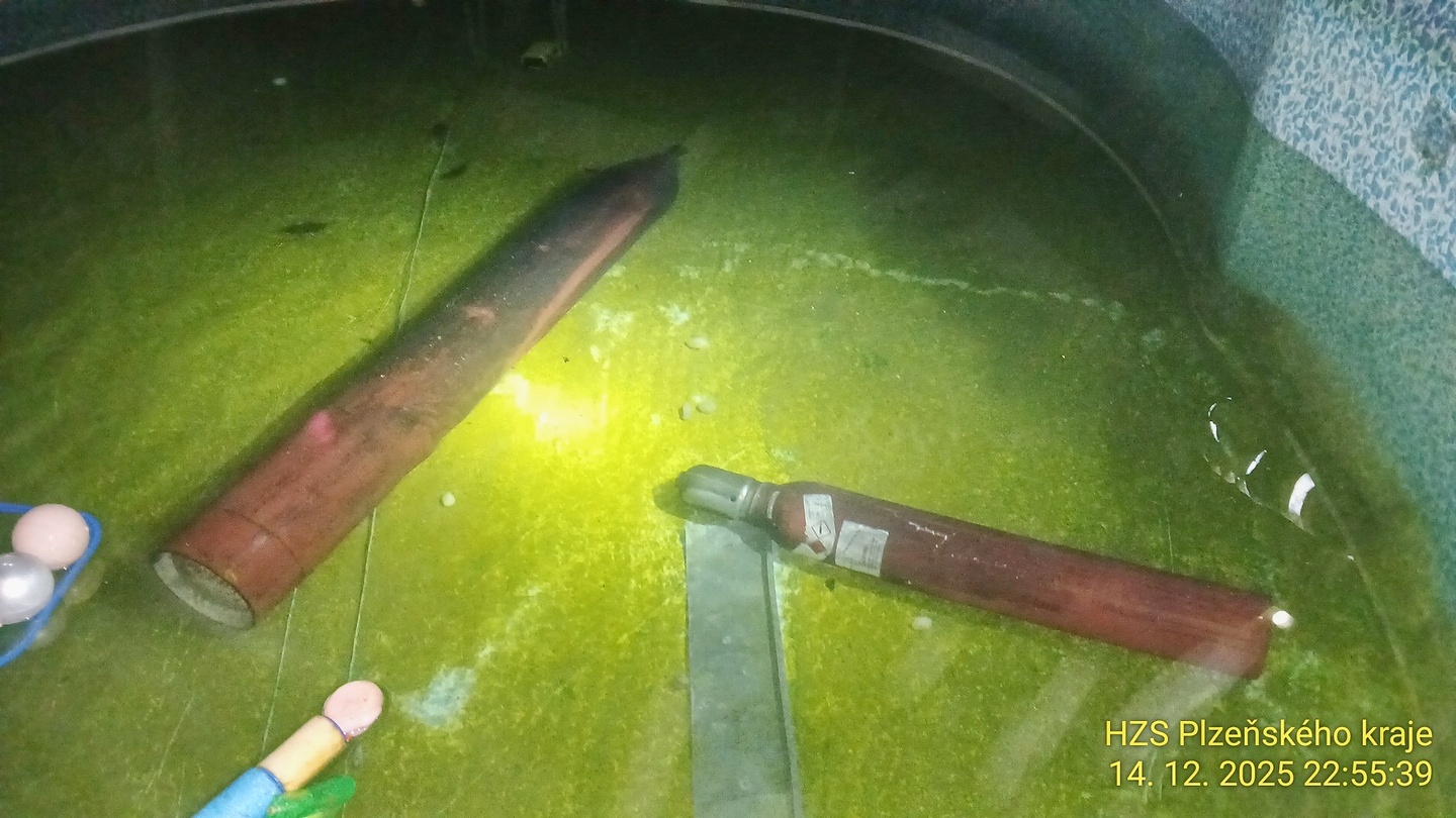 Tlakové lahve bylo nutné ochlazovat, hasiči je tedy vynesli z garáže a ponořili do bazénu.