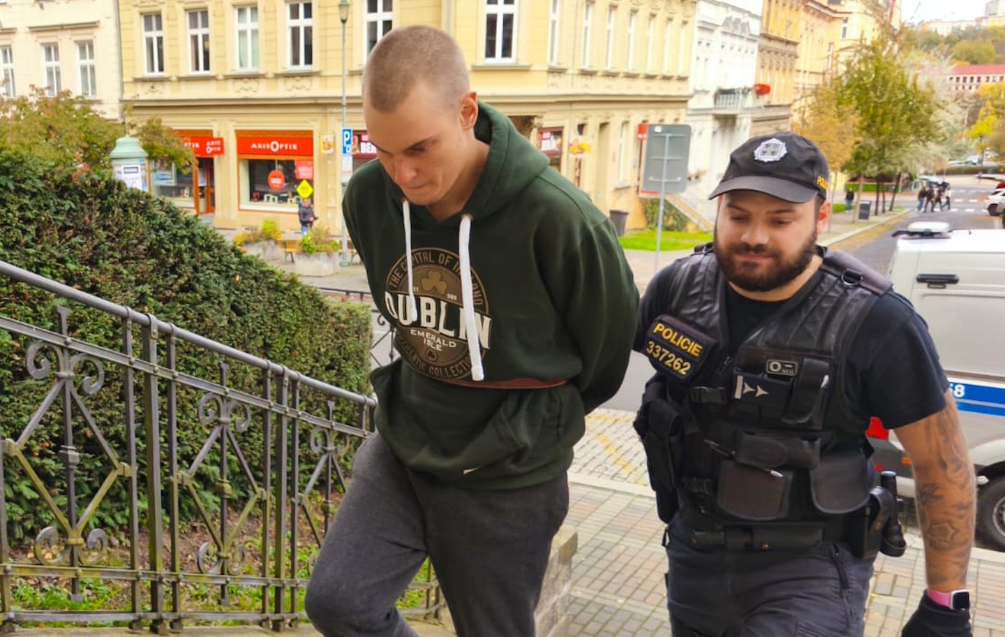 Dnes dopoledne přivezla policejní eskorta muže obviněného z mimořádně brutálního pokusu o vraždu k soudu v Karlových Varech, kde od půl dvanácté probíhalo vazební řízení.