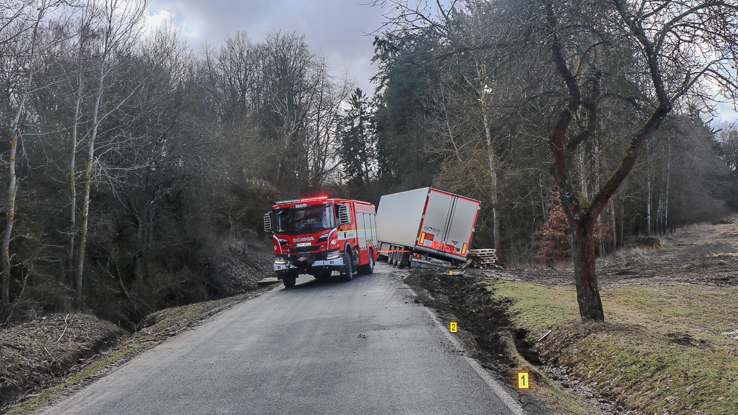 "Neznámý řidič s dosud neustanoveným vozidlem jel na Výškov a z dosud nezjištěných důvodů přejel do protisměru, kde jel řidič s jízdní soupravou složenou z nákladního automobilu a návěsu. Řidič uvedené jízdní soupravy na vzniklou situaci reagoval tak, že chtěl zabránit střetu s osobním automobilem a najel proto na krajnici, která se pod tíhou soupravy utrhla. Souprava následně sjela do silničního příkopu, kde narazila do betonového panelu a následně do mostku, na kterém se zastavila," popsala dopravní nehodu mluvčí policie.