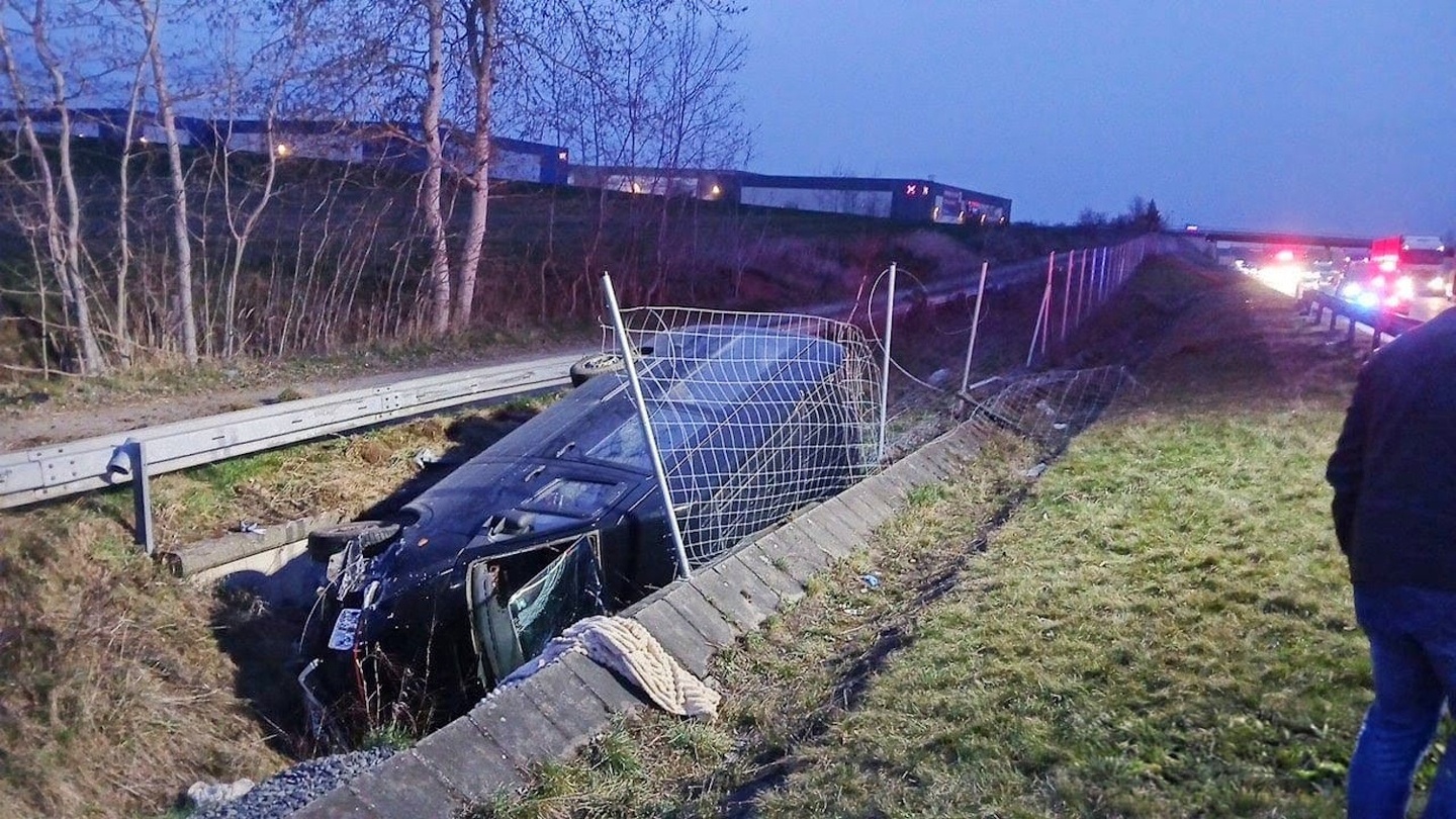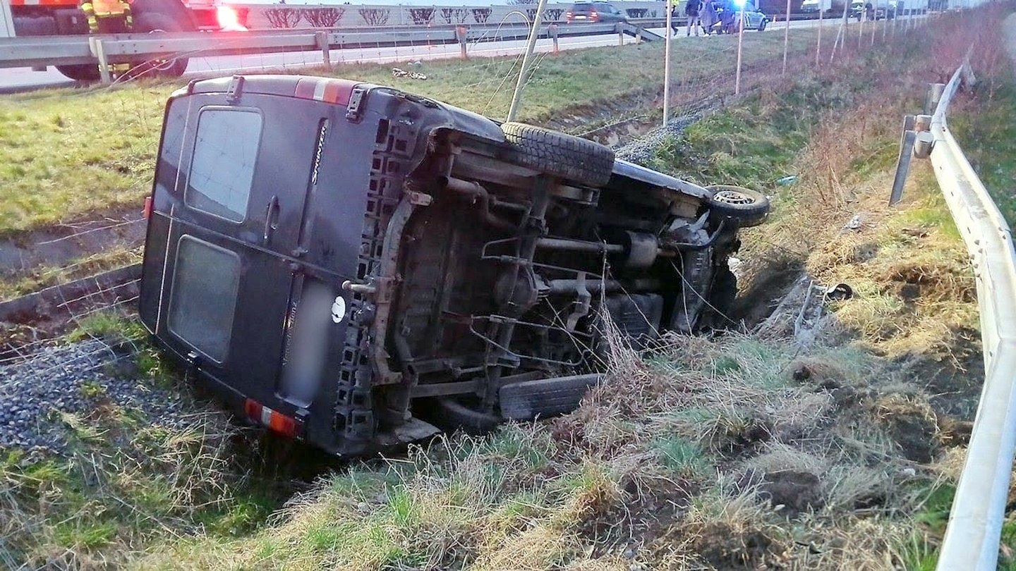 Dnes krátce po šesté hodině ráno došlo na 94. kilometru dálnice D5, tedy u exitu Nýřany ve směru z Plzně na Rozvadov, k dopravní nehodě, během které se střetlo osobní vozidlo značky Audi s mikrobusem značky Mercedes, který následně skončil na boku přímo v ústí betonového propustku.