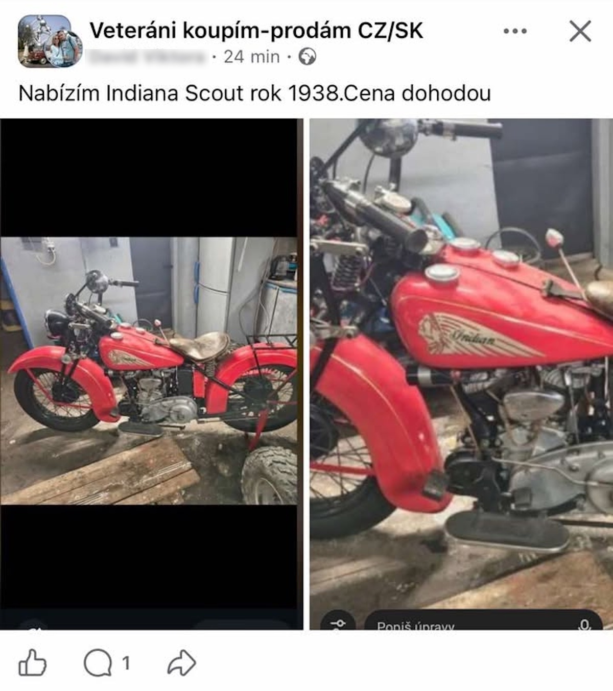 "Mohu potvrdit, že policistům se skutečně podařilo vypátrat jeden z odcizených veteránských motocyklů. Majitel bude mít jistě radost, neboť mu během příštích dnů policisté vrátí jeho motocykl tovární značky Indian typ Scout z roku 1938," uvedla nám dnes mluvčí policie.