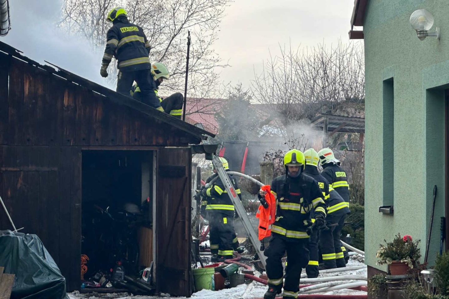 Hustý černý kouř byl vidět ze širokého okolí, oheň se velmi rychle šířil, a protože hrozilo rozšíření požáru i na rodinný dům, velitel zásahu vyhlásil 2. stupeň požárního poplachu. Hasiči evakuovali přilehlou budovu, odpojili elektřinu a zahájili hasební práce nasazením tří útočných proudů.