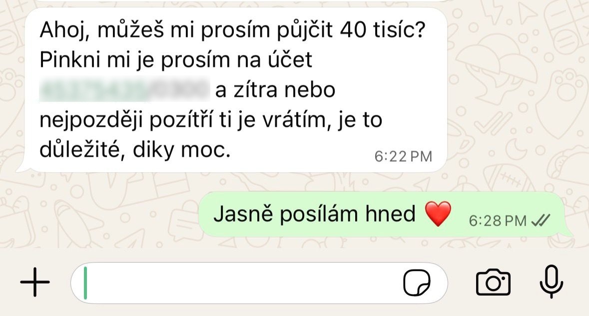 Útočník následně má kontrolu nad konkrétním účtem a pak už jen zbývá všem kontaktům v adresáři odeslat zprávu s žádostí o finanční pomoc v tíživé situaci. Jelikož zpráva přijde od rodinného příslušníka, kamaráda či známého, oběti neváhají a částku dle pokynů zašlou na daný účet," objasnil princip podvodu tiskový mluvčí policie.