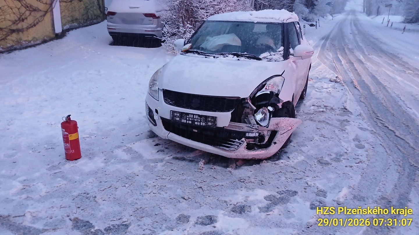 K další nehodě dnes ráno došlo přibližně o půl hodiny později i v Plzni Božkově v ulici K Hrádku, kde se střetly dva osobní vozy a jeden byl odražen do stěny domu. I zde se nehoda naštěstí obešla bez zranění osob.