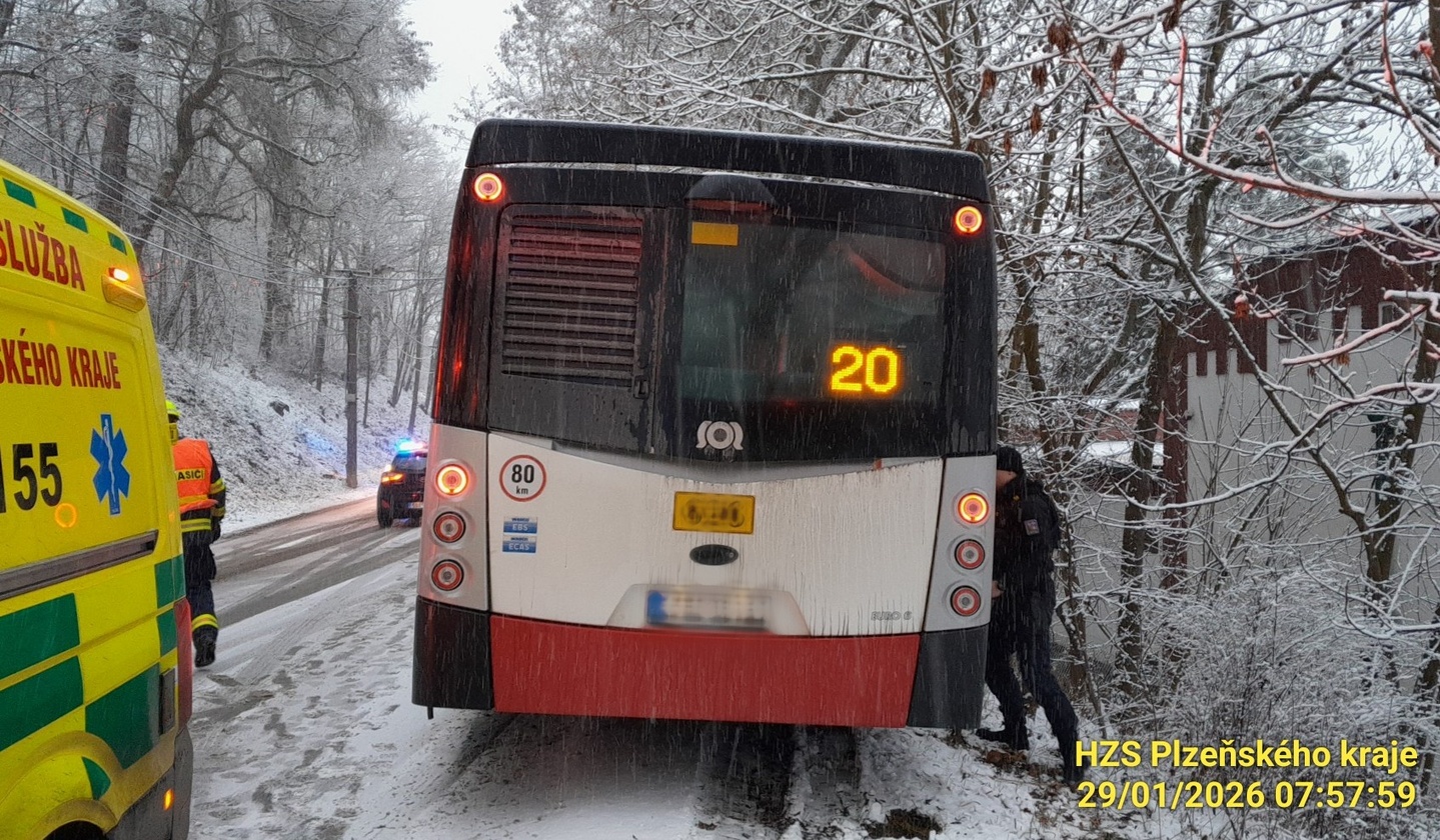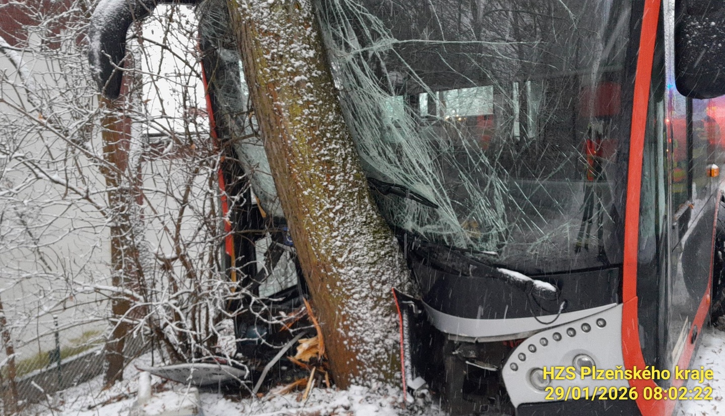 Před osmou hodinou ráno pak došlo v Plzni v ulici Na Roudné k havárii autobusu do stromu.