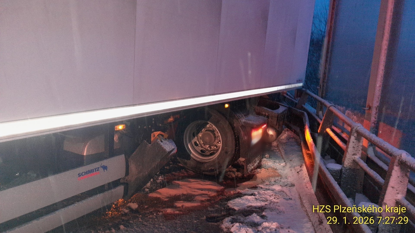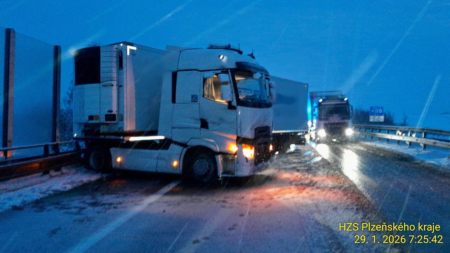 Obě nehody se naštěstí obešly bez zranění, hasiči zajistili prostor nehody a likvidují únik nafty z kamionu. Zásah na místě podle mluvčího hasičů komplikuje počasí.