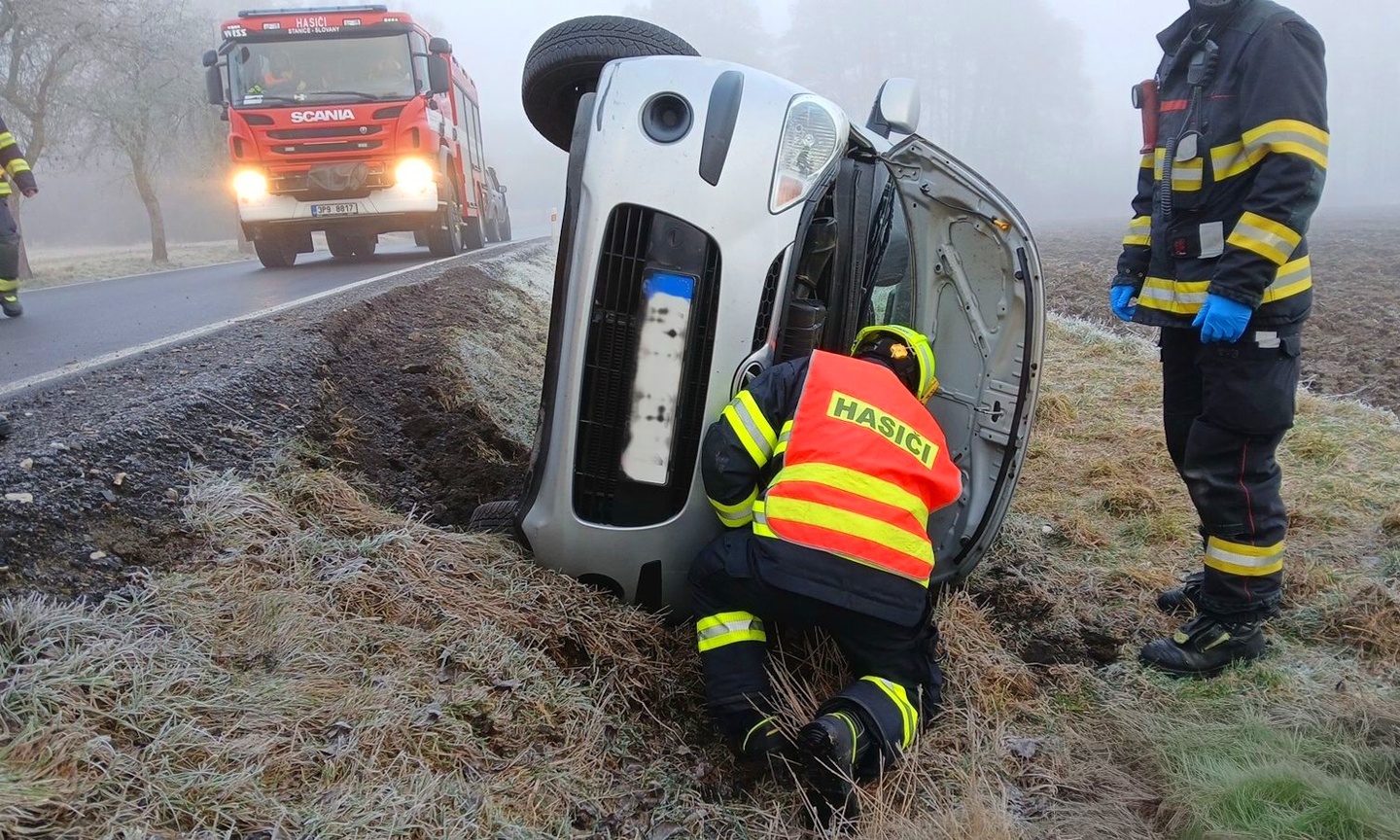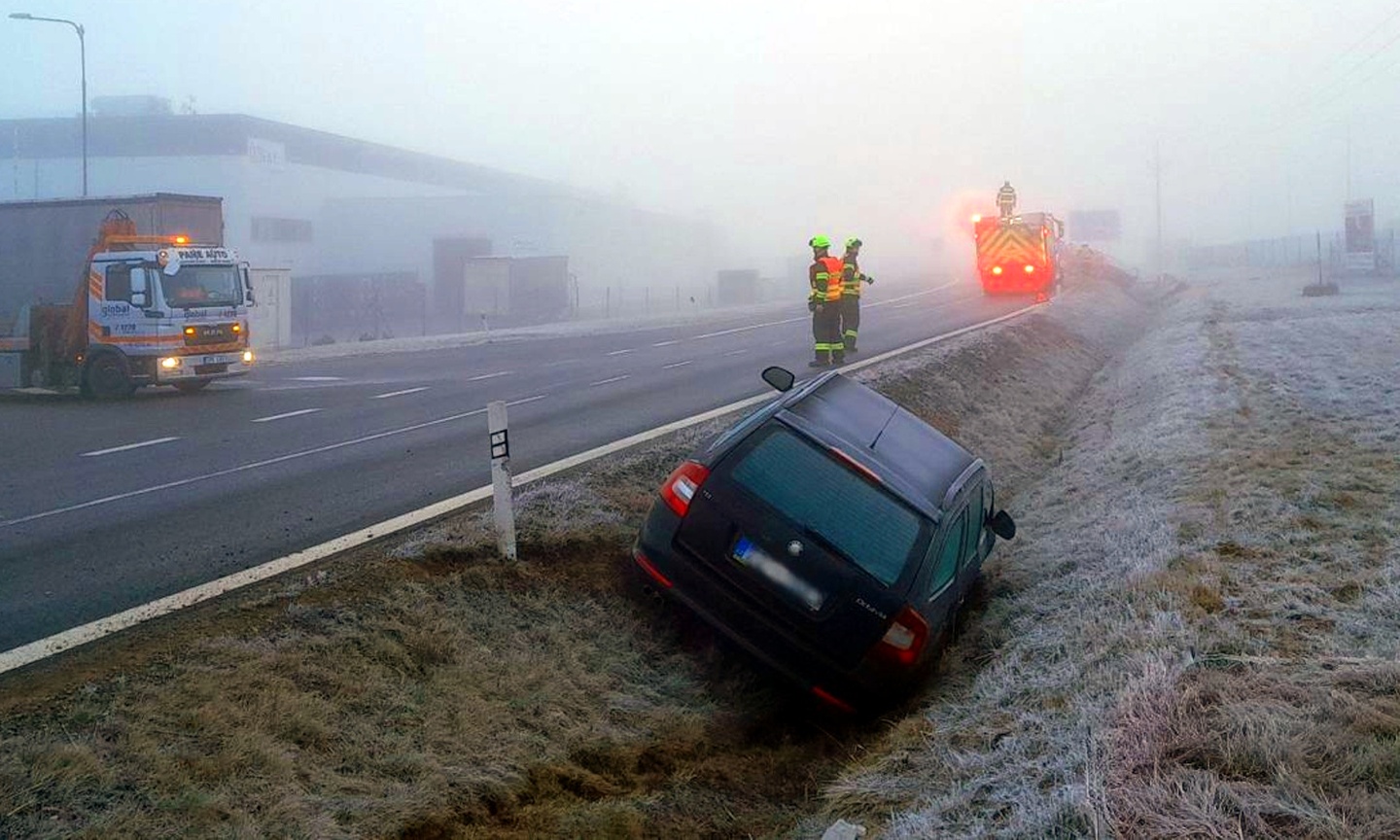 Před půl osmou vyjížděli hasiči mezi Starý Plzenec a Šťáhlavy, kde osobní vozidlo skončilo mimo komunikaci. I zde sehrála hlavní roli kluzká vozovka. Řidič vyvázl bez zranění, hasiči provedli zabezpečení vozidla a preventivní opatření proti případnému vzniku požáru.