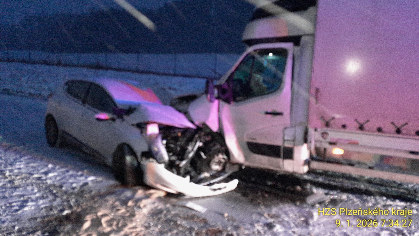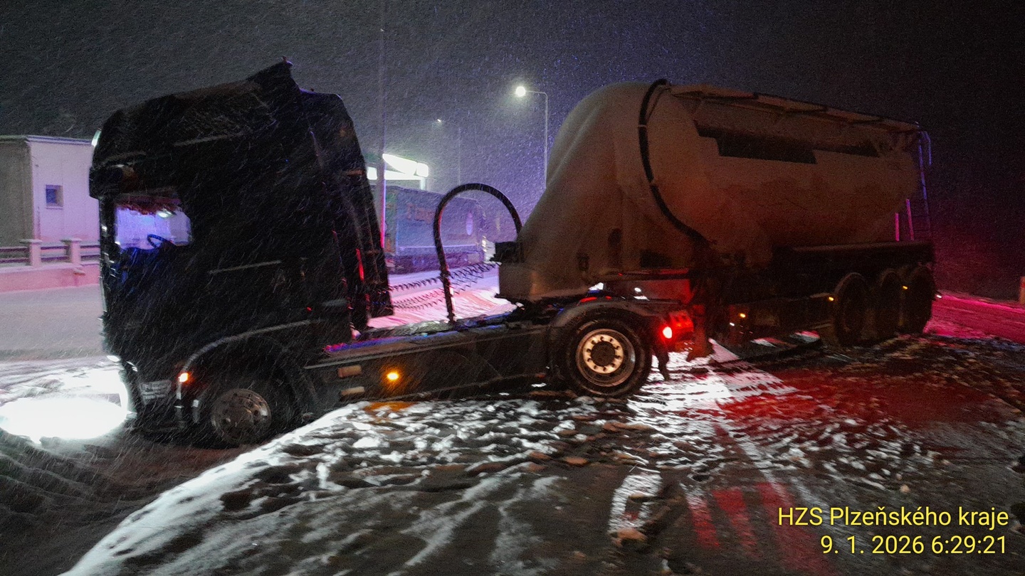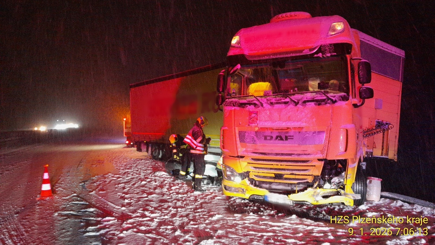"Mohu potvrdit, že od rána zasahujeme již u sedmé dopravní nehody. Nejvíce problémů je na D5 na Tachovsku. Tam na 112 a 106 km směr Praha řešíme nehody kamionů, které komplikují dopravu. Další nehodu kamionu řešíme na silnici 26/I u Vránova. Zajišťujeme místa nehod a provádíme protipožární opatření," uvedl nám mluvčí hasičů.