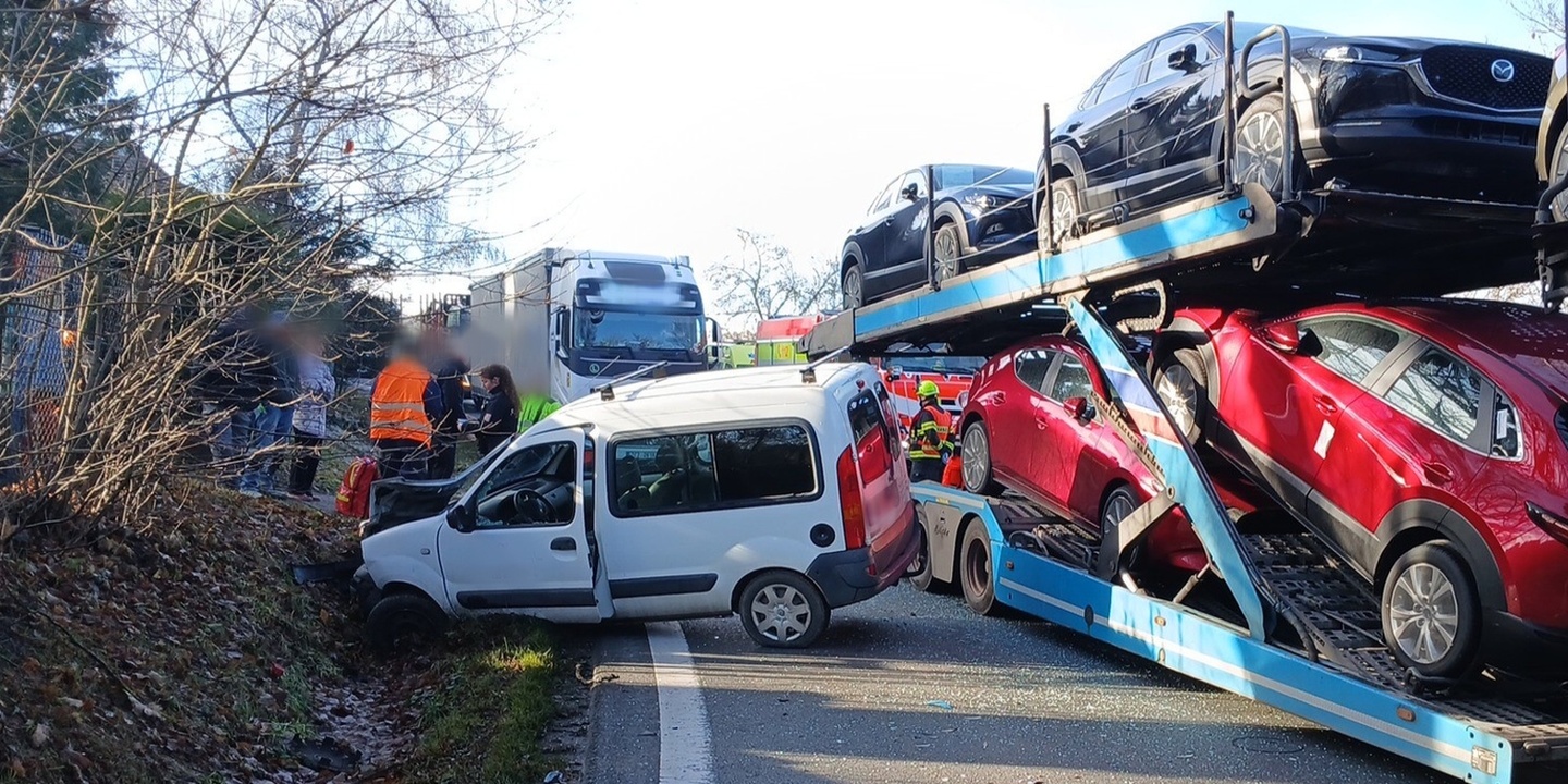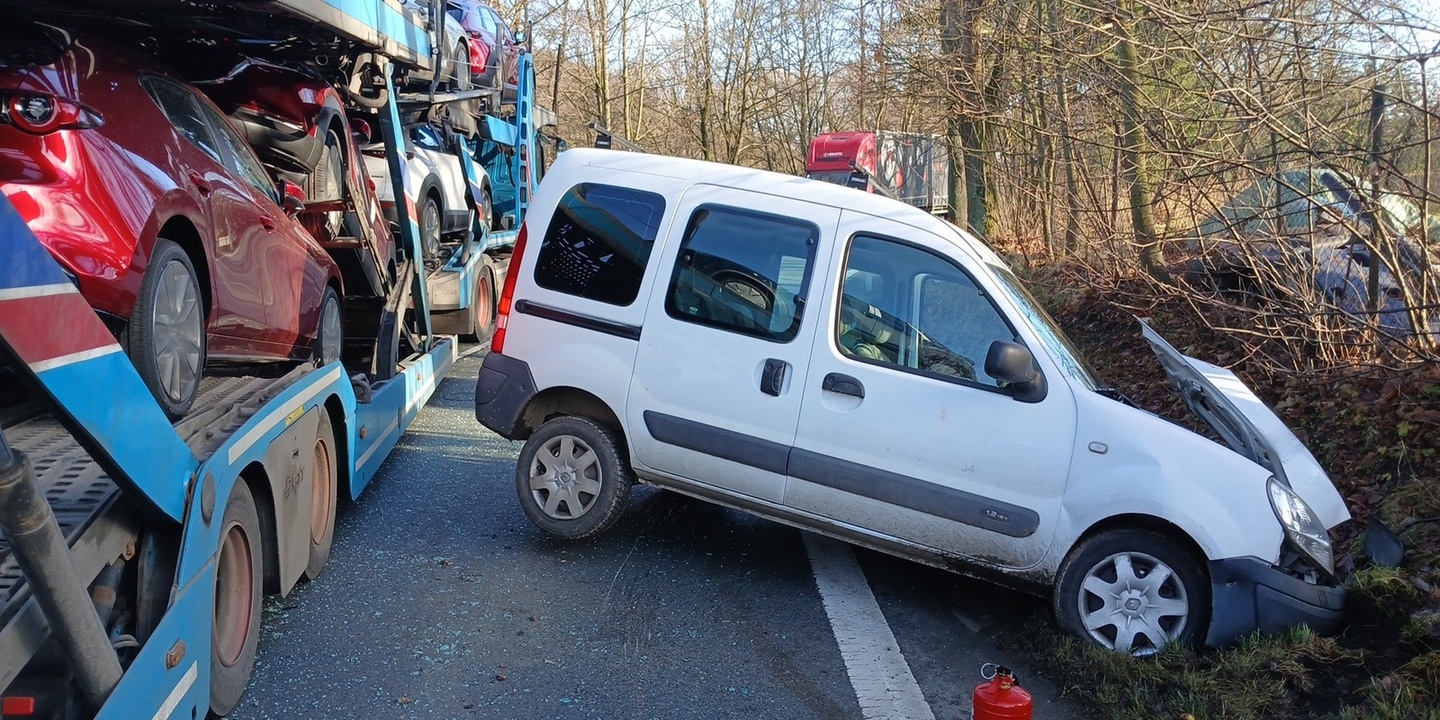 Dnes kolem jedné hodiny odpoledne došlo na silnici I/20 vedoucí z Plzně na Písek nedaleko Kasejovic k dopravní nehodě, během které se střetl osobní vůz Renault s nákladním vozem pro převoz automobilů.
