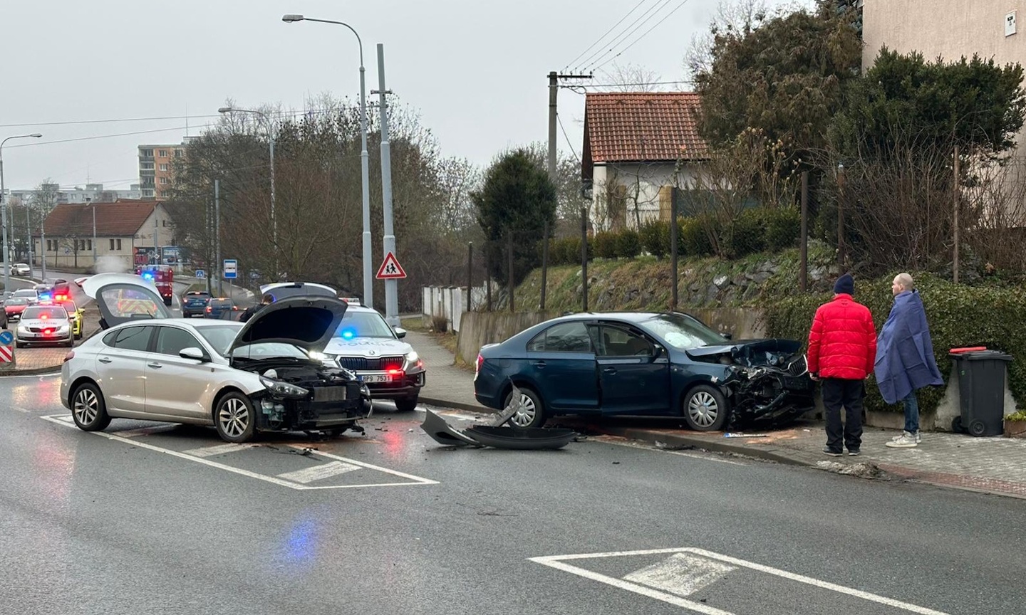Dnes kolem druhé hodiny odpoledne došlo v Zábělské ulici v Plzni k dopravní nehodě, během které se střetla dvě osobní vozidla, přičemž obě skončila v protisměru a jedno z nich pak na chodníku, po kterém naštěstí v tu chvíli nikdo nešel.