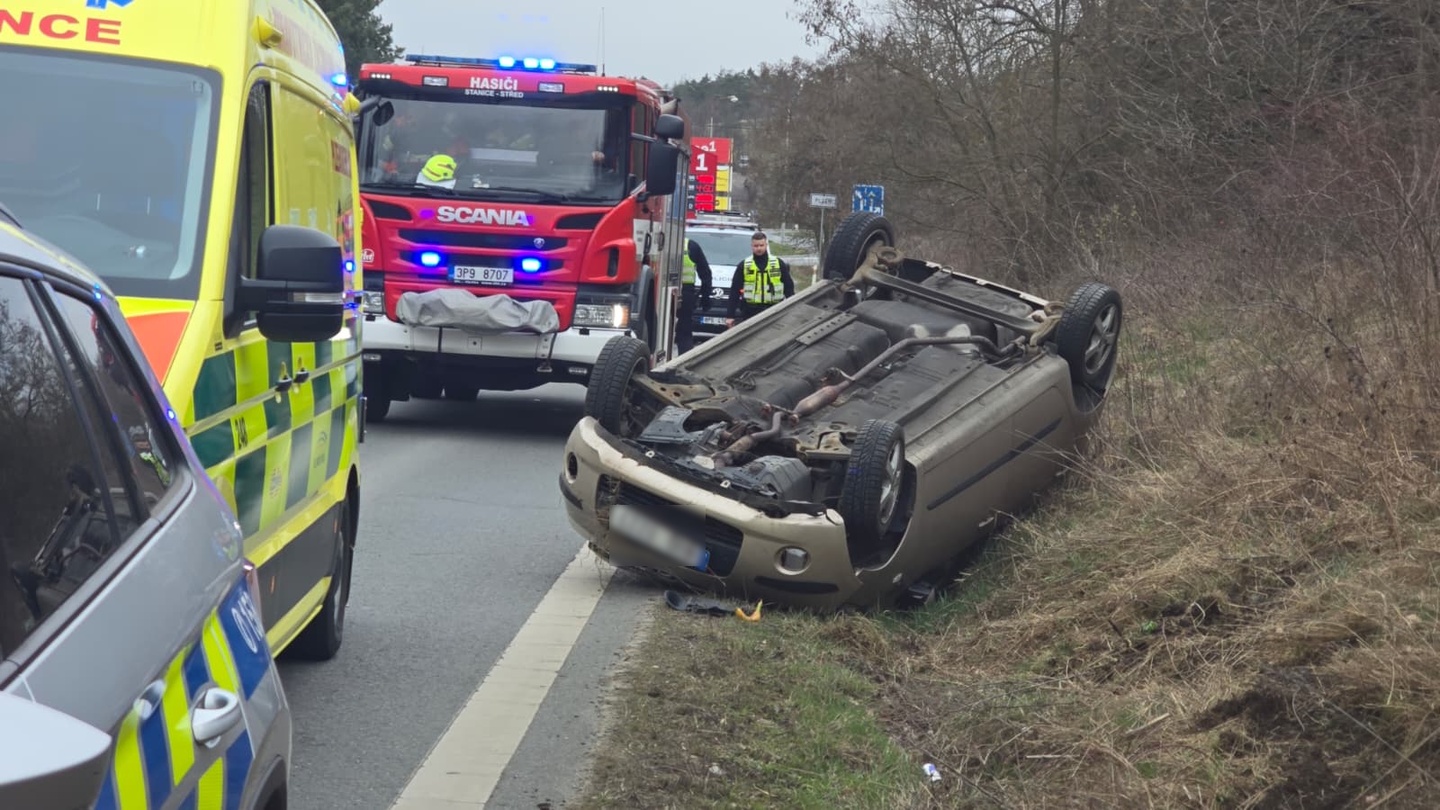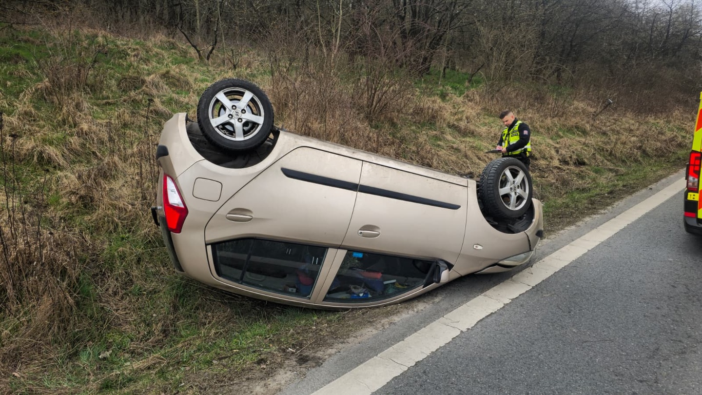 Dnes před devátou ráno došlo na Klatovské třídě v Plzni Liticích k dopravní nehodě, během které se osobní vůz Hyundai po vyjetí ze silnice otočil o 180 stupňů a převrátil na střechu.