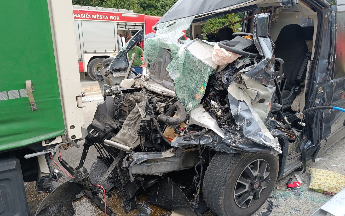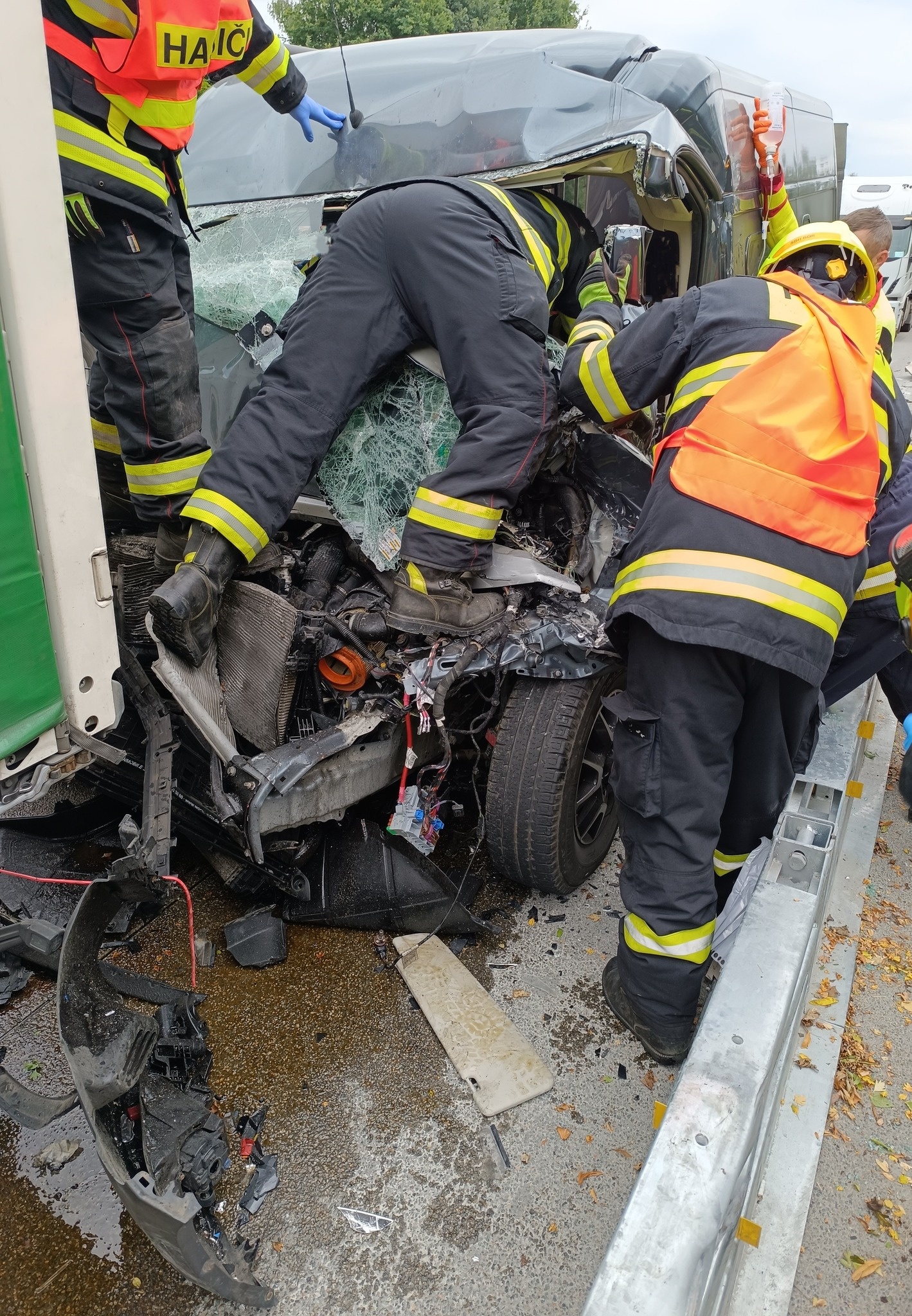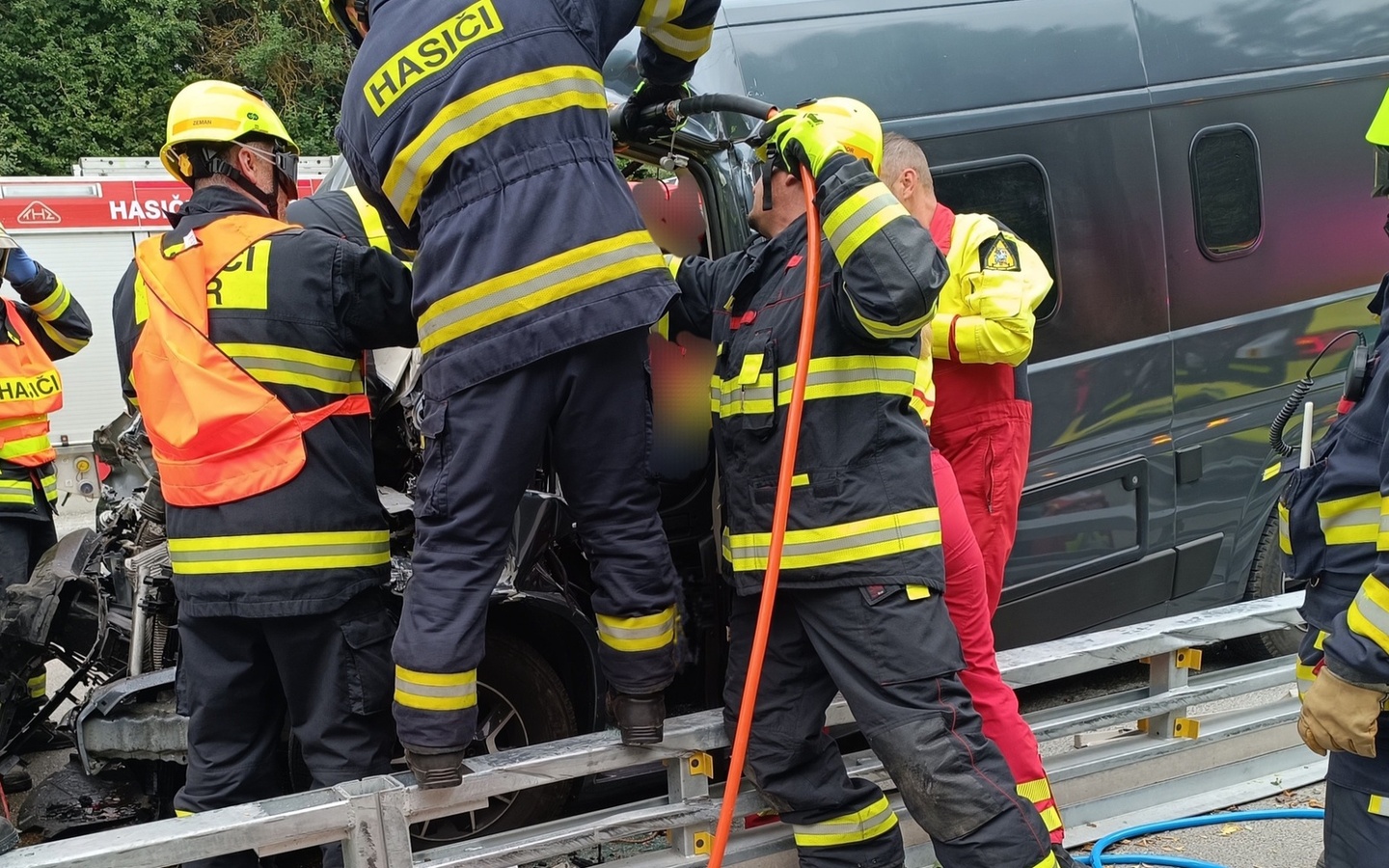 Hasiči zajistili prostor nehody, provedli protipožární opatření a z havarované dodávky vyprostili velmi vážně zraněnou Němku. Následně ještě asistovali záchranářům při její resuscitaci.