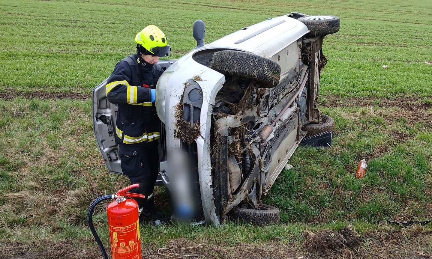 V převráceném autě zůstal zaklíněný řidič